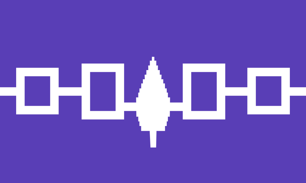 The flag is a purple field with five figures. At the center is the Sacred Tree where the Iroquois met in council. On either side of the central device are two different sized squares or rectangles connected to one other and to the Sacred Tree by a narrow band representing how the League was formed.