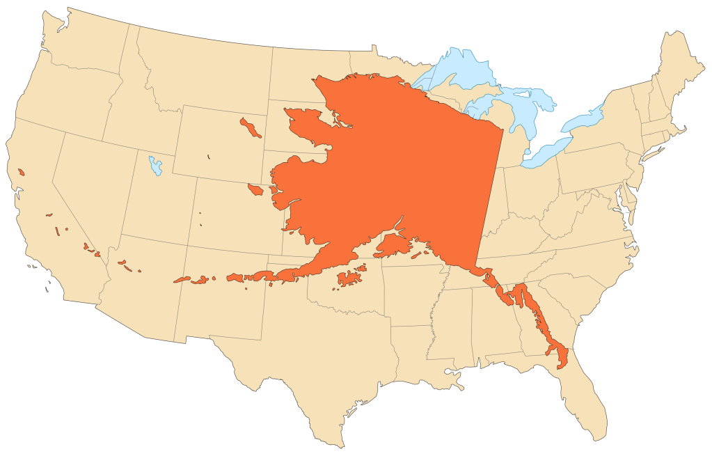 The largest state, by area, in the United States: Alaska. The US ‘purchased’ the territory from Russia in 1867 for $7.2 million (2 cents per acre). Of course it had been the home of indigenous people for thousands of years. Proportionally it has the highest indigenous population in the country. Alaska is larger than Texas, California and Montana combined.
