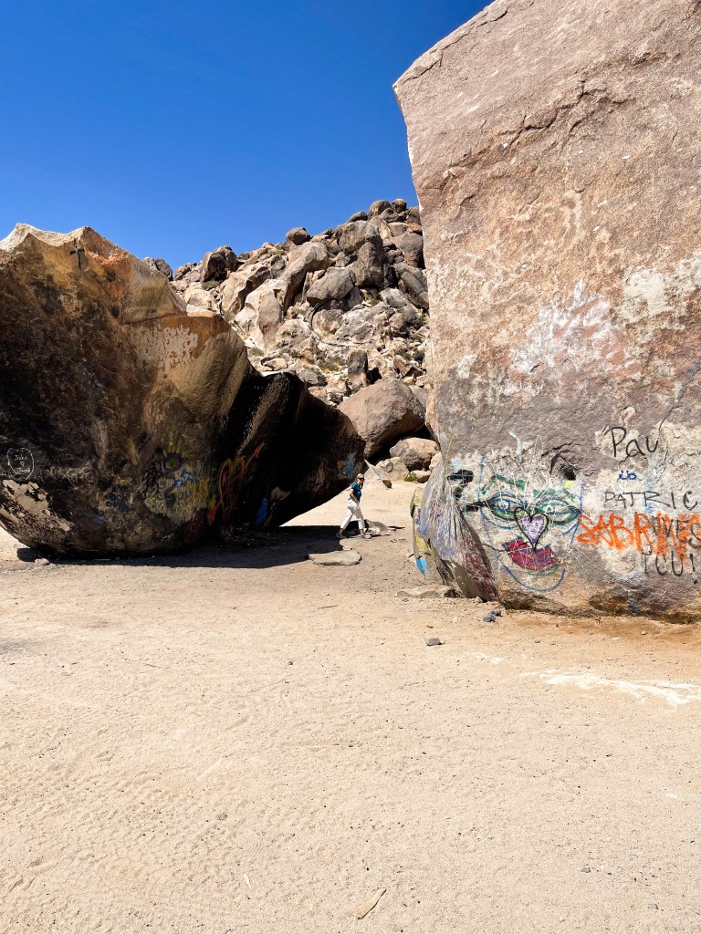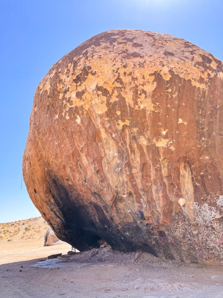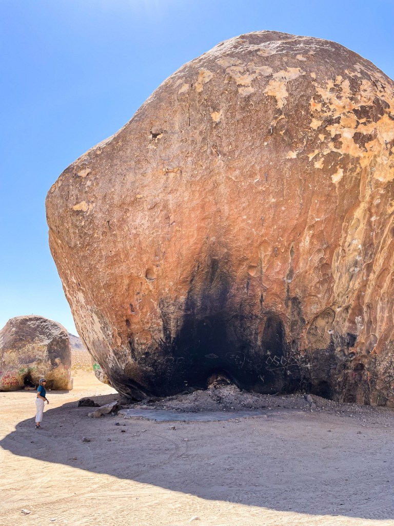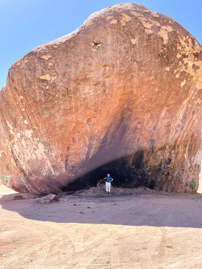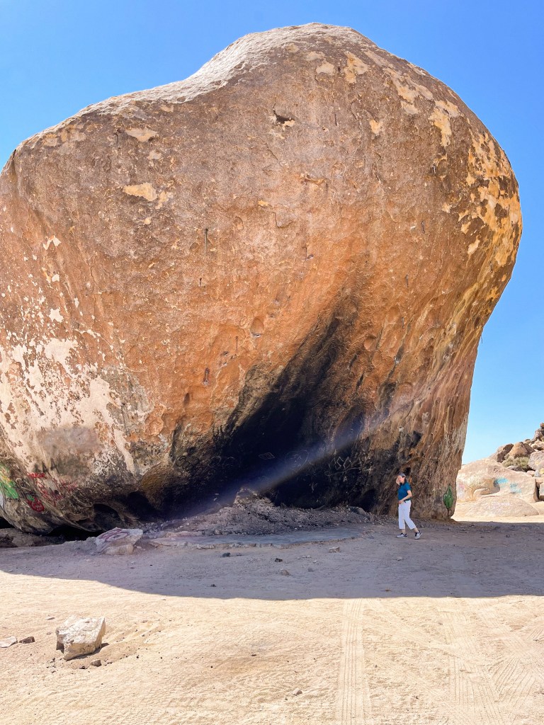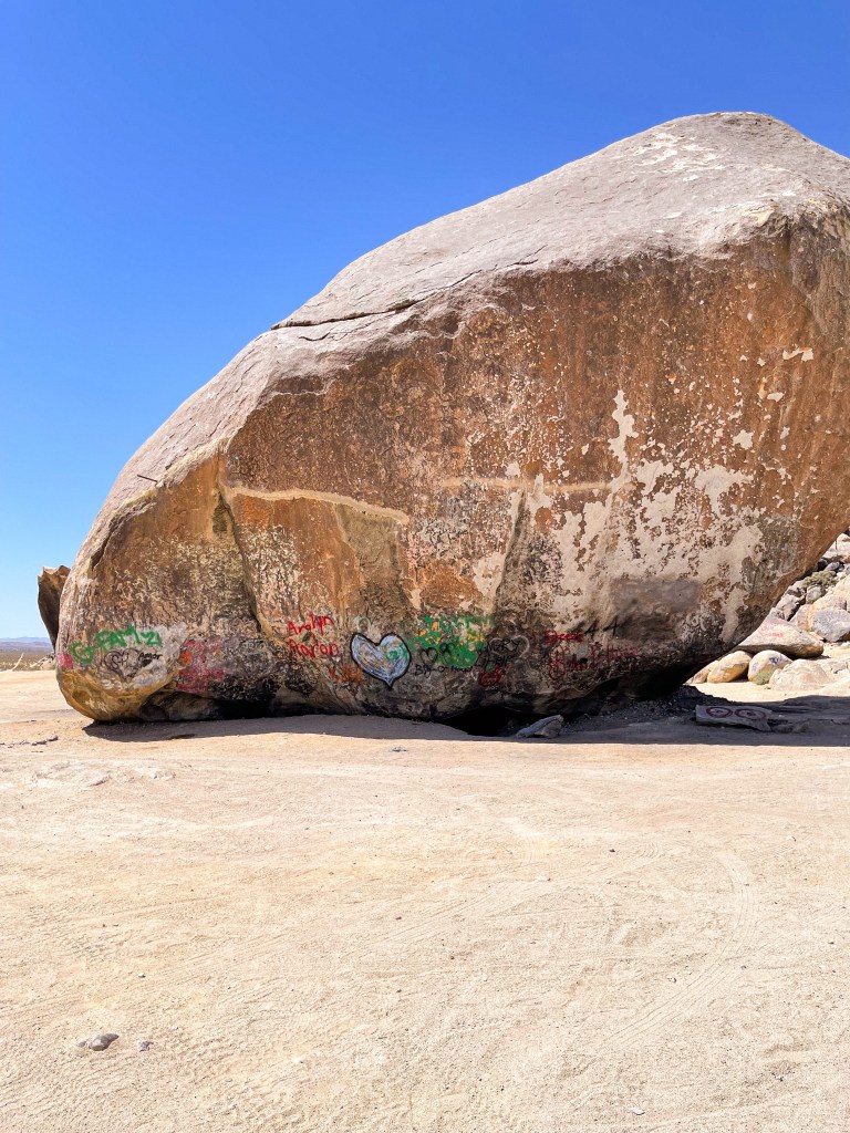 It has a strange, colorful history that includes UFOs and a guy blasting a tunnel under it to build a place to hide then blowing himself up under the rock after being wanted by the sheriff. Kids come out and paint graffiti on it regularly. At one time it had an airstrip right next to it and was used as an emergency landing site for planes in Southern California.