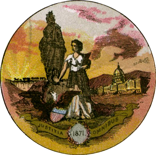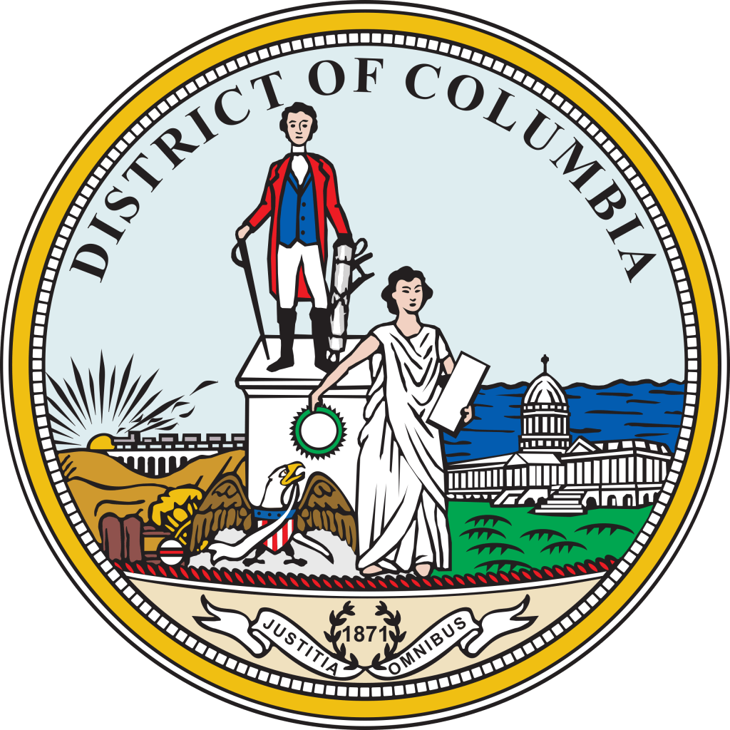 The original coat of arms for Washington DC. Lady justice placing a wreath on The Statue of Freedom. The Latin on the bottom translates as “Justice for All.”