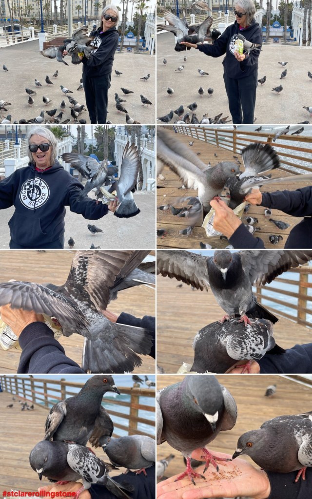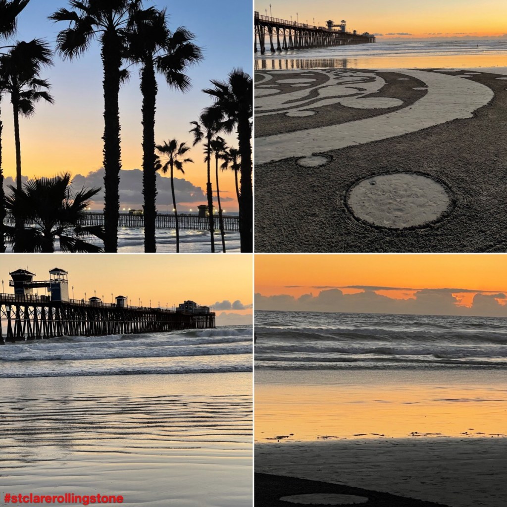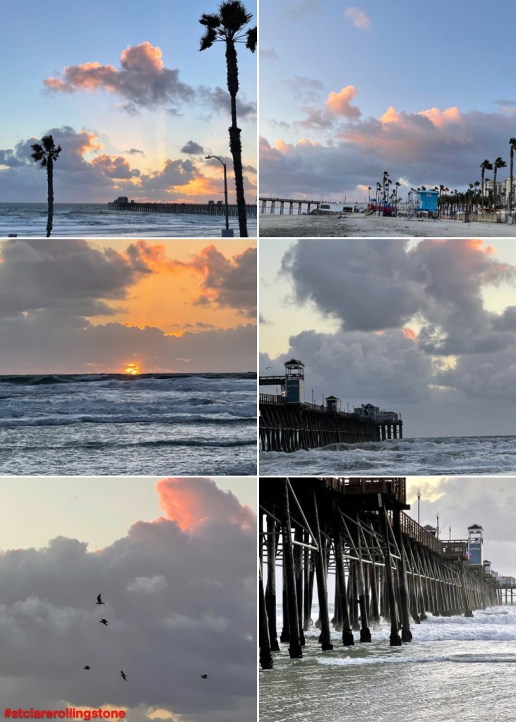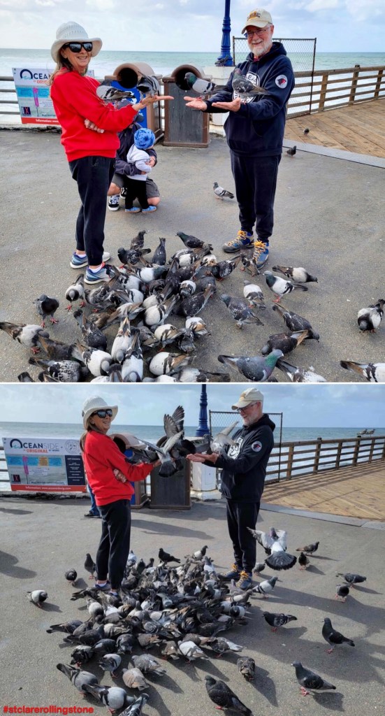 Is it possible to have too many sunset shots?Can I catch both the Navy ship and the Navy helicopter in the same shot?Remember don’t leave when the sun goes down, wait a little while for the sky to have different colors. On the morning of March 3rd Denise decided it would be fun to find out if the pigeons on the pier would like some left over bread crumbs. She was quite popular with the winged population. Oceanside has a couple nice museums that we visited. This is a painting at the Oceanside Museum of Art. It is by a regional artist, Duke Windsor. He titled it, ‘A taller order with Monarchs’. It is acrylic with imitation gold leaf. The man was obsessed with hamburgers. At the Oceanside Museum, The California Museum of Surfing, a nationally recognized museum, Bethany Hamilton donated the actual surf board she was riding when she was attacked by a shark in Hawaii. We would stand on the Oceanside Pier and watch the surfers. Waves are a spectacularly interesting thing to contemplate. Meanwhile, down by the pier.