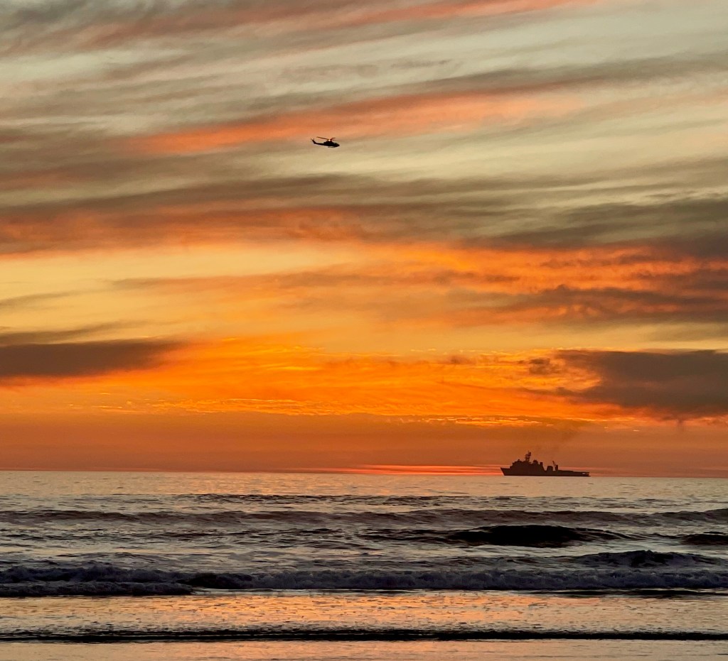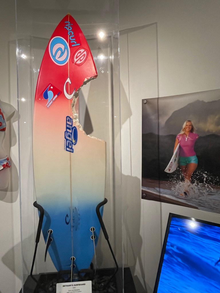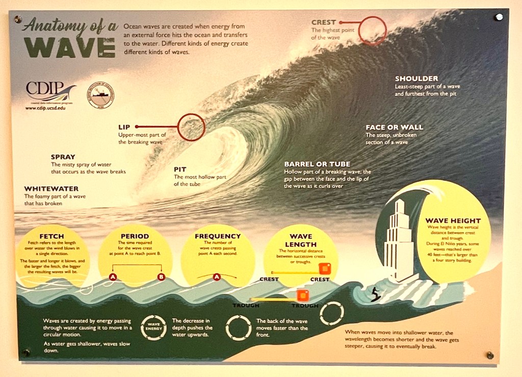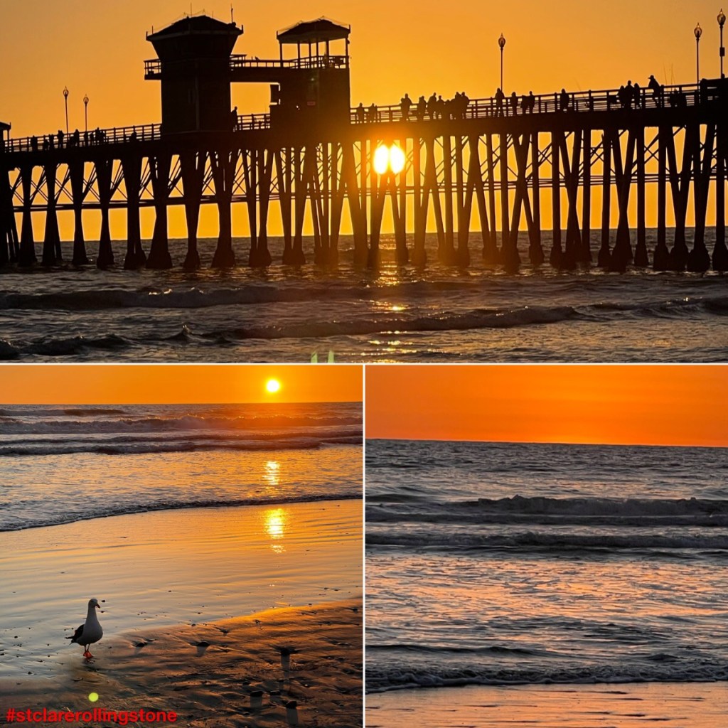Is it possible to have too many sunset shots?Can I catch both the Navy ship and the Navy helicopter in the same shot?Remember don’t leave when the sun goes down, wait a little while for the sky to have different colors. On the morning of March 3rd Denise decided it would be fun to find out if the pigeons on the pier would like some left over bread crumbs. She was quite popular with the winged population. Oceanside has a couple nice museums that we visited. This is a painting at the Oceanside Museum of Art. It is by a regional artist, Duke Windsor. He titled it, ‘A taller order with Monarchs’. It is acrylic with imitation gold leaf. The man was obsessed with hamburgers. At the Oceanside Museum, The California Museum of Surfing, a nationally recognized museum, Bethany Hamilton donated the actual surf board she was riding when she was attacked by a shark in Hawaii. We would stand on the Oceanside Pier and watch the surfers. Waves are a spectacularly interesting thing to contemplate. Meanwhile, down by the pier.