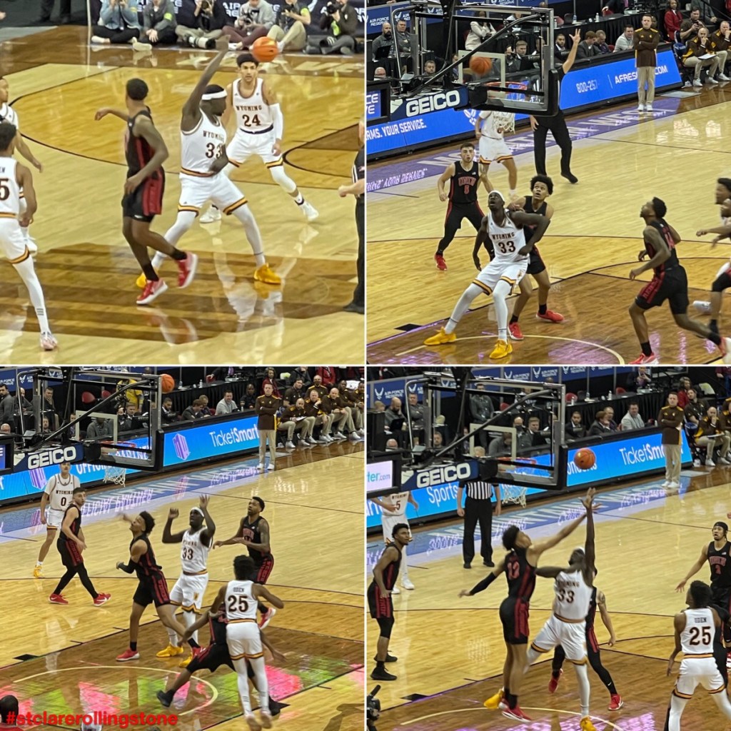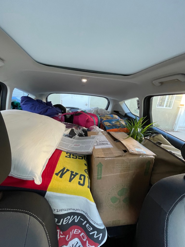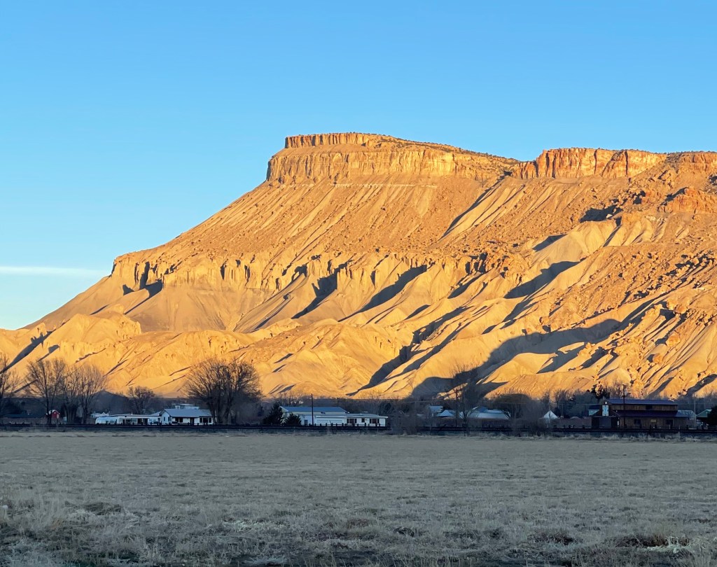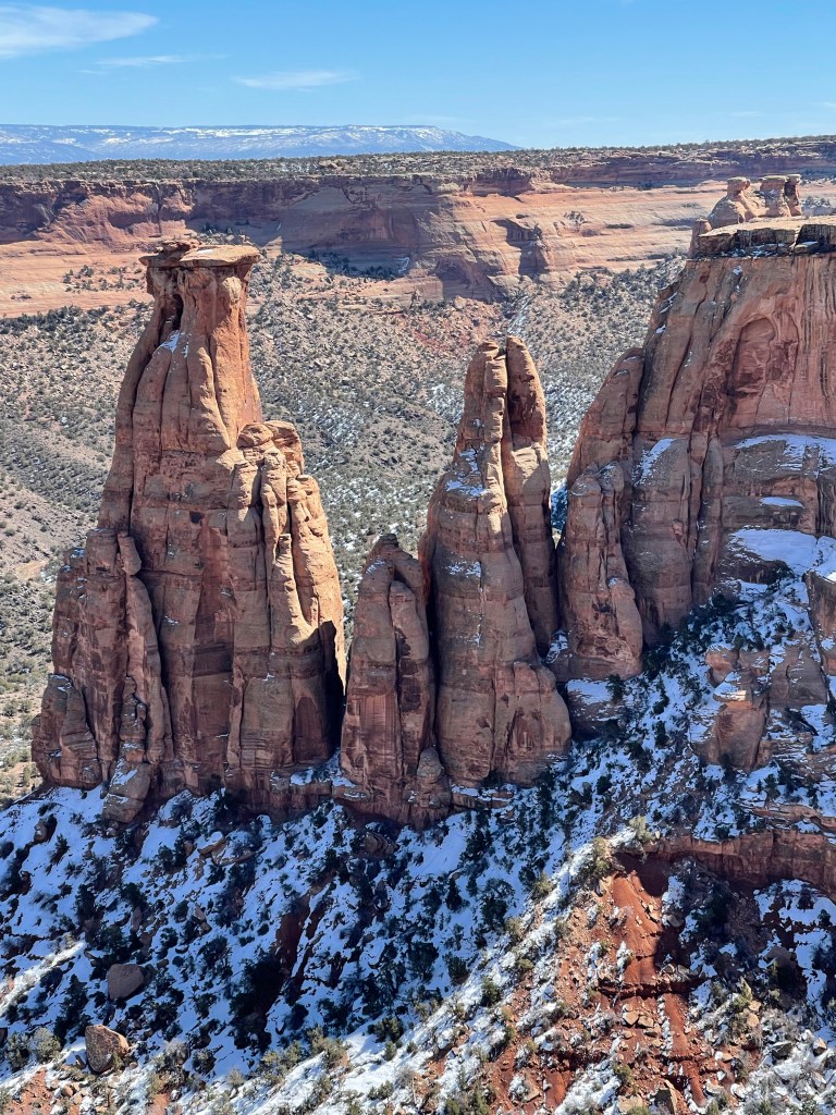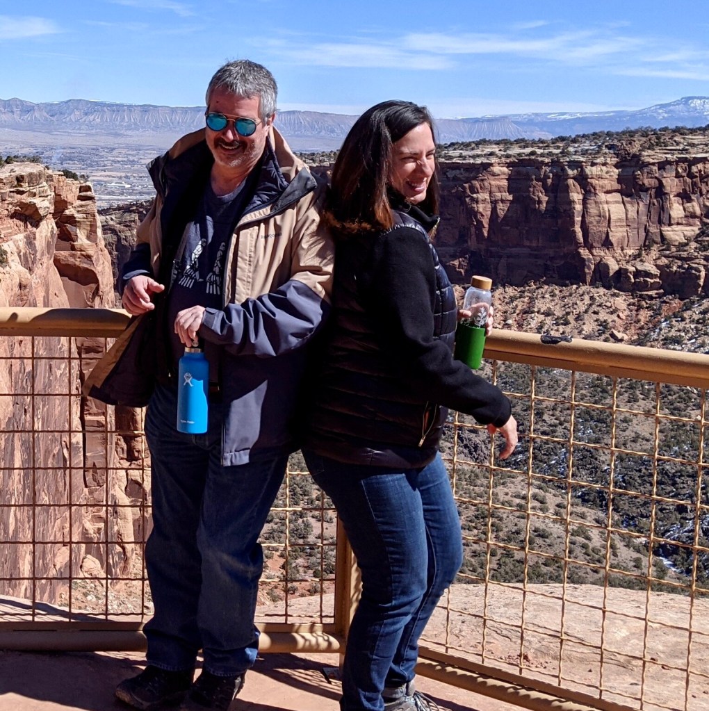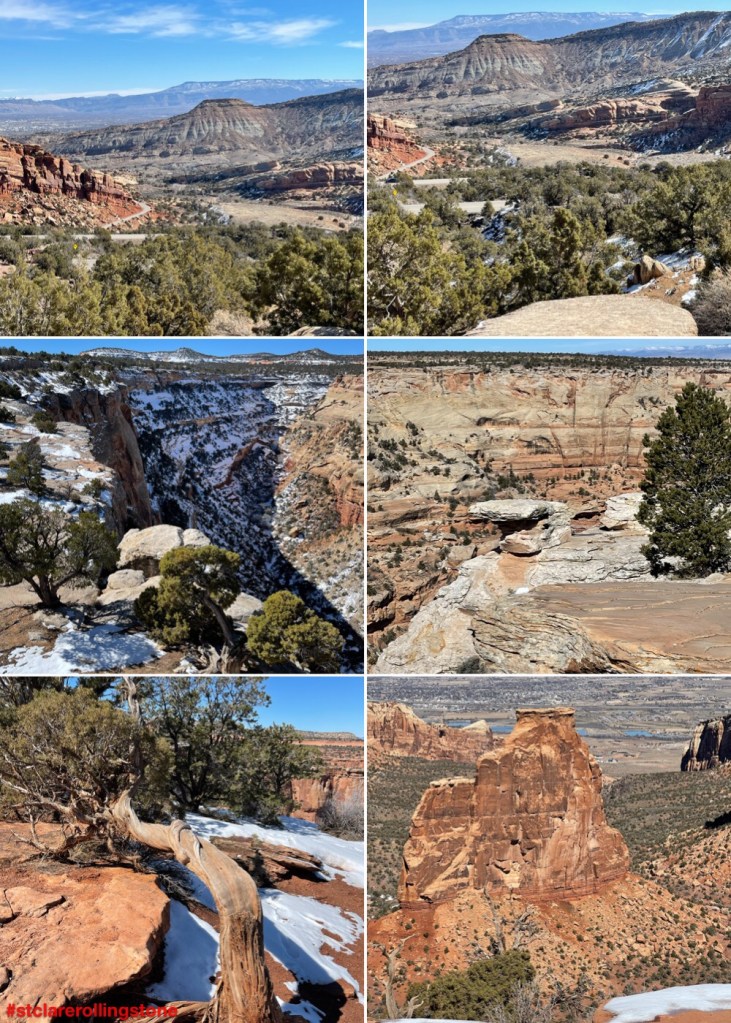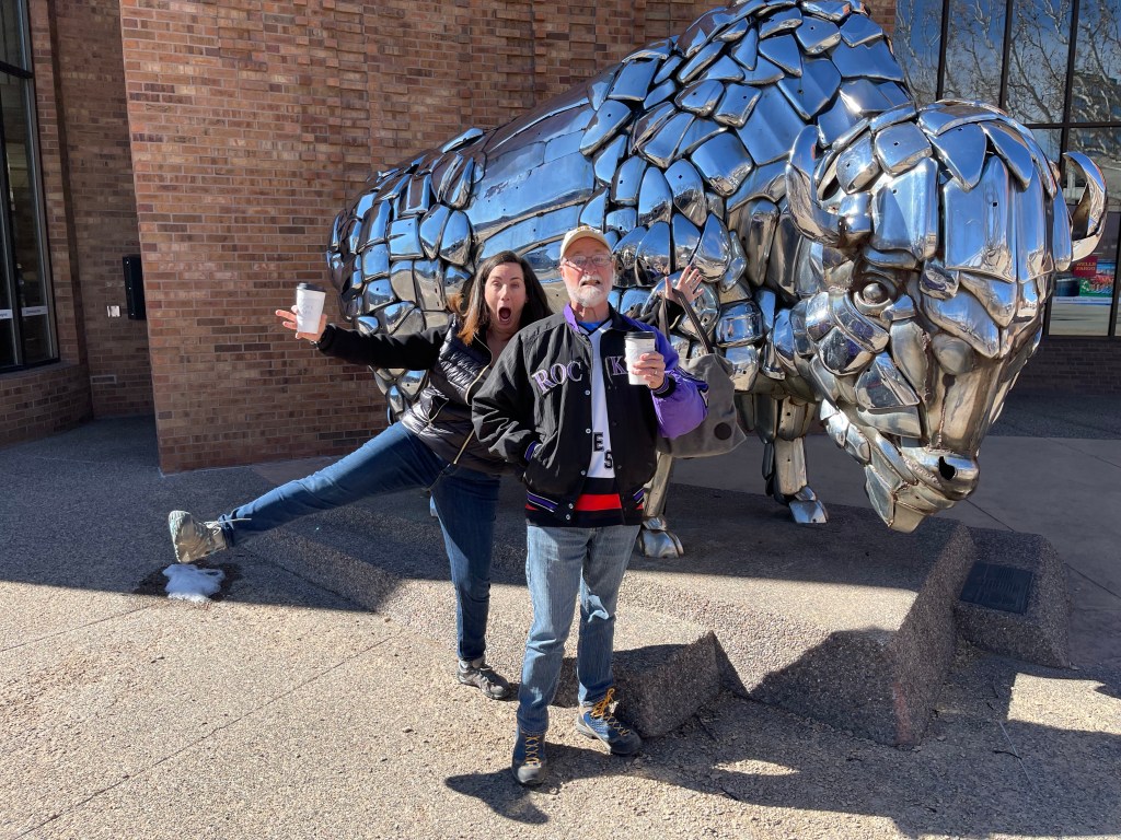 The inside of our 2014 Ford C-Max, loaded to the gills for the trip back to Michigan. But, many adventures are yet to happen. It was hard to believe that we traded all of those gorgeous sunsets in Oceanside for this view looking out of our Virgin Hotel window in Las Vegas. But we were there for a reason. We joined our old friends, Marilyn Graham and Margaret Fomer for a special event in Vegas. Another first for us. We have never attended a college tournament championship. We have watched a myriad of sports events for our grandkids. And here we were sitting with our dear friend Marilyn Graham as she watched her grandson, Graham Ike (pronounce ‘E-Kay) play in a big time college championship. In the first half the Cowboys are a little sluggish but Graham is controlling the boards and is all over the court. In the second half Graham starts scoring and continues to dominate rebounds. Down to the wire – with 22 seconds the Cowboys are up by 1. They add a basket and the final is a thrilling 59 – 56. Hoarse from screaming, Denise meets up with her buddy, Graham’s Uncle, Daniel. The route from Vegas to Colorado is a wonder to behold. You go from Nevada into Utah then into Arizona before approaching Colorado. No matter how many times we have driven it, we are constantly say, …’Wow! Look at that.’The next stop on our trek east is Palisade Colorado to spend time with our old friends Greg and Simone Pearman. Our relationship has always been based on goofiness and laughter. Knowing how much we enjoy finding new coffee places, they took us to Grand Junction and Kiln Coffee. Our friends took us into The Colorado National Monument. Spectacular scenes and too difficult to decide which ones to not include. Look in any direction and be awed by creation. When I volunteered in the San Bernardino National Forest I would talk about the difference between a Preserve; a Reserve; a Monument; a National Forest and a National Park. We are meant for connection. We bid adieu to friends who despite not seeing for years we pick up right where we left off. We came back to our hometown of Denver where Denise met up with her Buddy Daniel Graham. And, No I am not buying her a slingshot. In the spirit of connection we spent time with our dear friends Grant and Margaret. They live in a ‘not too shabby‘ part of Littleton. They have many friendly neighbors who drop by regularly. The adventure drives off to a conclusion as we head back to our Michigan starting point. ‘See you in the funny papers’.