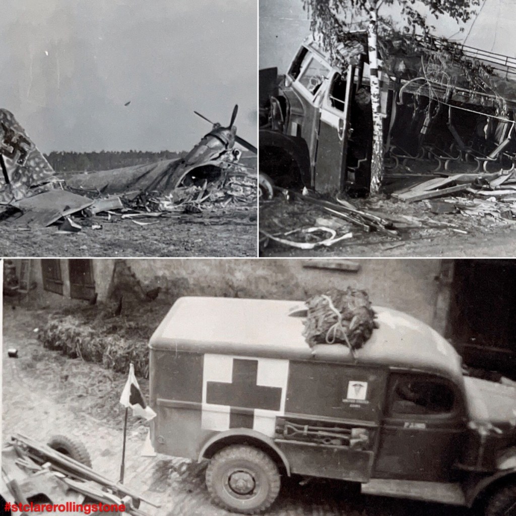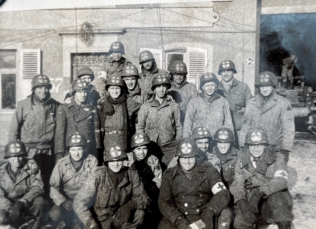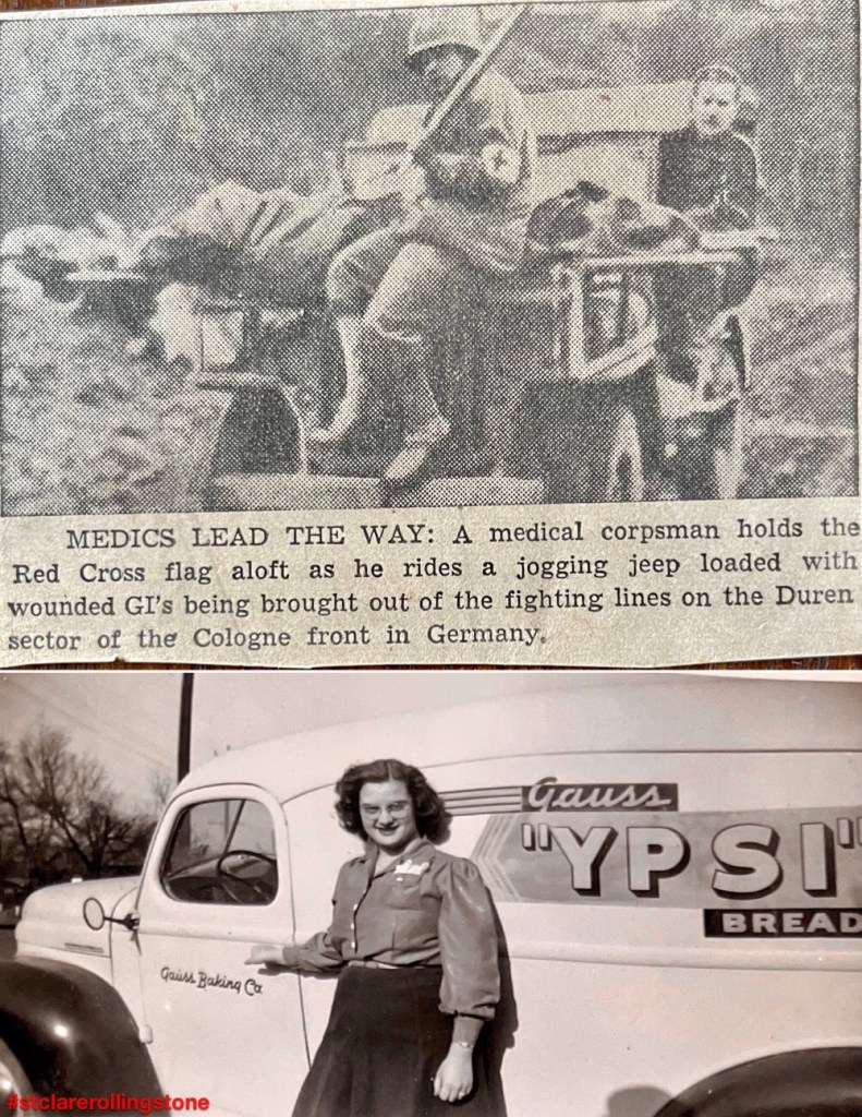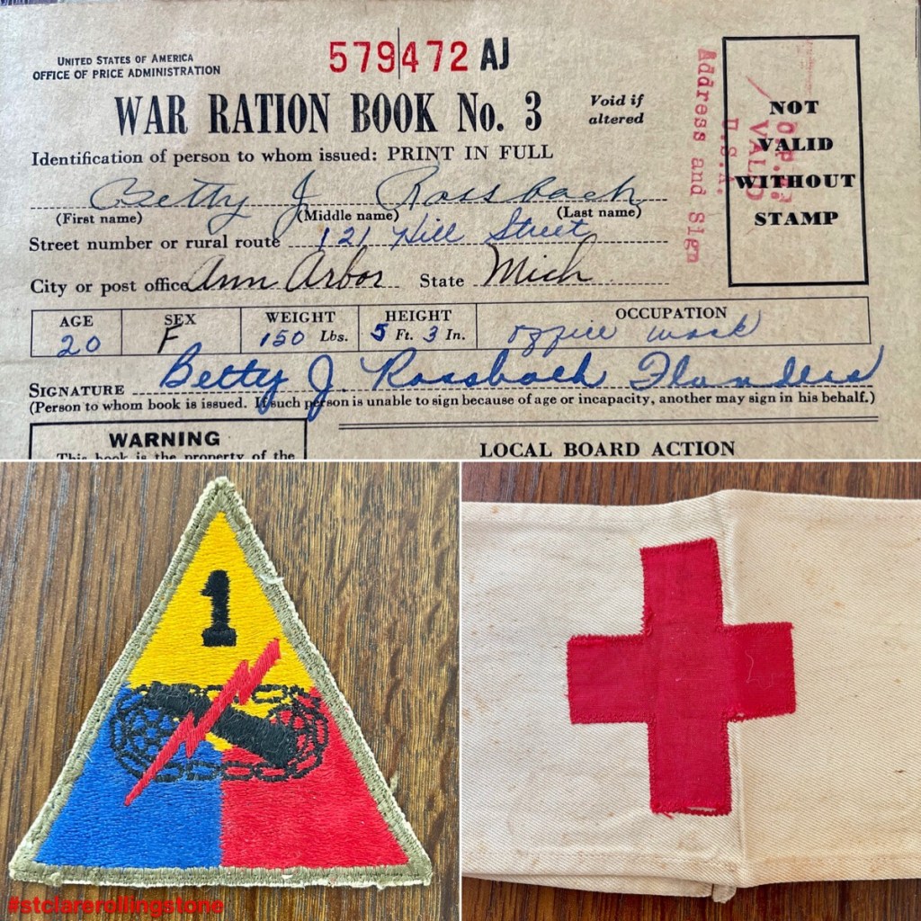 Soldiers were being shipped out to places they had never heard of. If you were in the ‘Cav, you went to Europe to fight the Nazis. If you had a girlfriend you did what thousands did and eloped to get married. This is the only ‘official’ wedding photo of my Mom and Dad in Napoleon Ohio. (In Ohio you didn’t need a blood test or a waiting period.)Before departure from the ‘States’ my Dad received more training to be a medic. I would imagine it didn’t feel like a long time before my Dad was on a transport ship heading across the Atlantic Ocean to death and destruction in Europe – wondering if he could handle what lie ahead and wondering if his new bride would be ok. Similar to thousands of other GIs, Dad faced a world at war. It was not a simple event in a history book. It was personal. It was real, day to day, stuff, just figuring out how to get through each moment.Bottom left: the patch from my Dad’s uniform. Bottom right: his medic arm band. Meanwhile at home Mom needed a ration book to purchase anything during the war. Dad didn’t talk much about what he saw and experienced while in the war. I have thought about that often. Maybe it wasn’t fair of me to expect that he would tell his son war stories. Why would he want to revisit, even in what I thought would be a benign way, the death and destruction he saw everyday. I know at some point he did have a camera because a few photos ended up in the scrapbook my Mom created. My Mom would scour the newspaper to find any news about where her new husband might be. She found jobs where she could to earn a little bit of money for her ‘nest egg’. All the time scared she may never see her husband again. Dad worked hard and was good at what he did. He was promoted to an E 5, which was sergeant. When Bill Flanders showed up you knew you were going to receive top notch care.