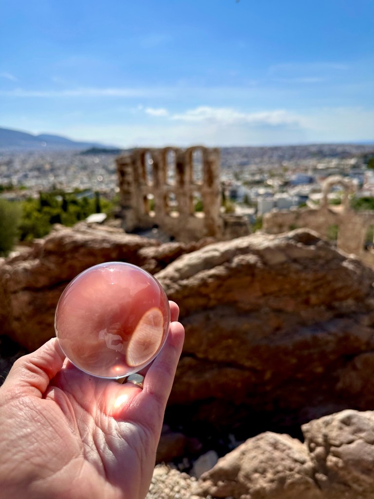 When standing at the base of the Acropolis on a bright sunny day: Do not try to use your fancy crystal photography ball by holding it in your hand. The title of this shot is: AHHHHHH!