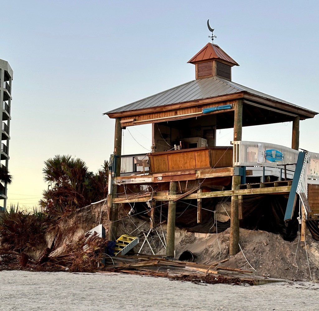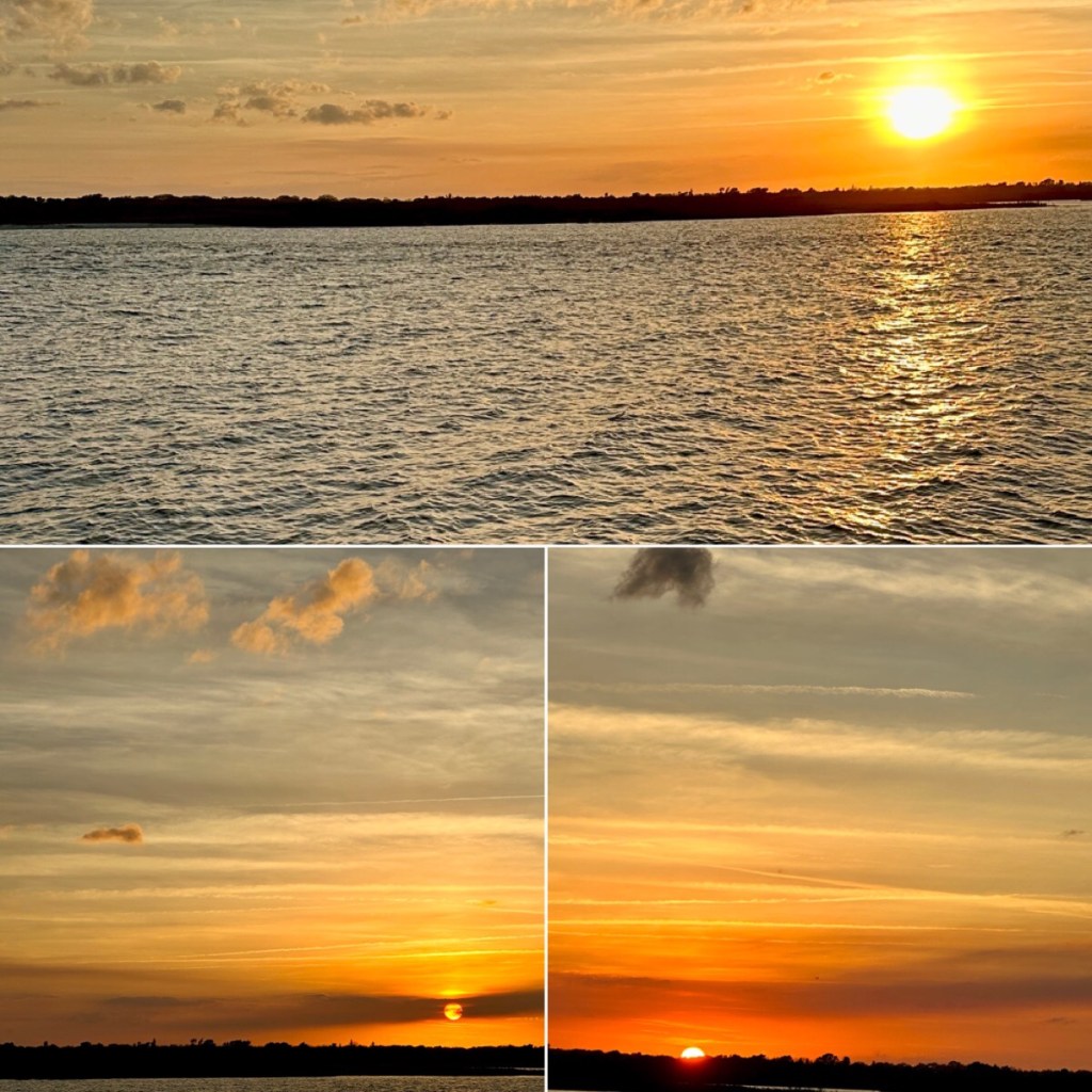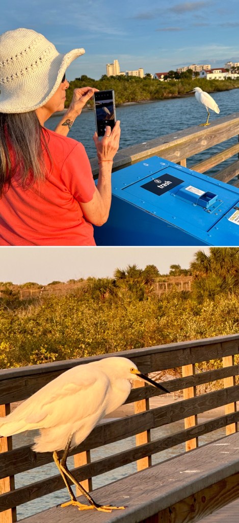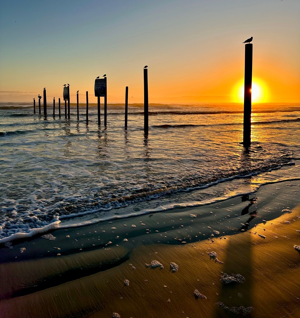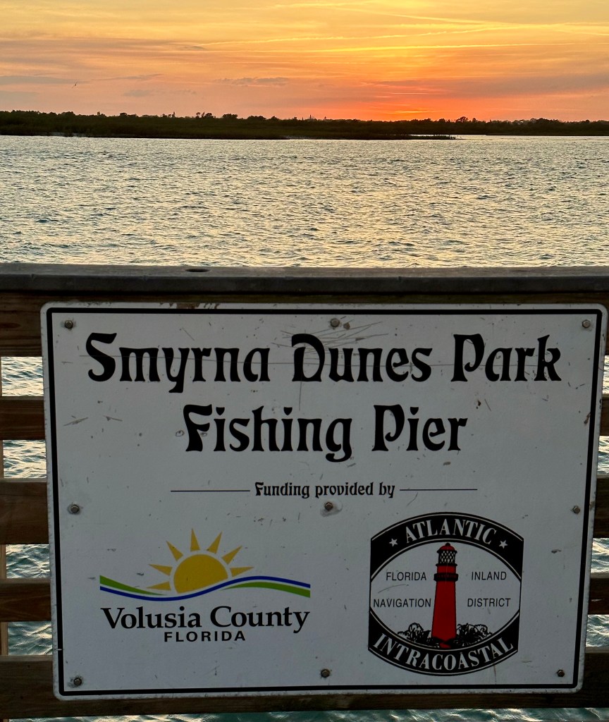 Last year we wintered in Oceanside California. Every day we went down to the beach to see the sunset. Here on the east coast we looked forward to sunrises. The first morning in New Smyrna Beach we rushed down to the boardwalk at the end of our block to see our first sunrise. These are not blurry photos…it was completely socked in with heavy fog…oh well. We just drove 1860 miles and we would not be denied our first sunrise…dang it! The sun finally popped through the fog and our initial sunrise was in the books. Gull coffee klatch January 2, 2023. In addition to local coffee places we scout out local ice cream businesses. We met a couple who had just moved from Georgia. Jim & Jen bought a local high quality ice cream joint and now had a new home and a new business. It is all homemade with top quality ingredients. It was mighty tasty. And you can always tell a high quality place when you see fantastic art on the walls. At 7:18 the next morning we were on the fogless beach for our first clear sunrise. The true nature photographer must have the correct angle. Other photographers just stand there. Gary still holds the theory, ‘it’s not the destination – it is the journey’. Always on the lookout for the different angle. January 3rd was our first clear look at some of the damage Hurricane Ian had done to New Smyrna Beach. Ian was a category 4 hurricane that hit New Smyrna on September 28th. Three plus months later many parts of Florida are still cleaning up. Our research staff, Denise, looked for the best places to see the sunset in New Smyrna. We drove the 15 minutes to Smyrna Dunes Park to see the sun go down over the Indian River.