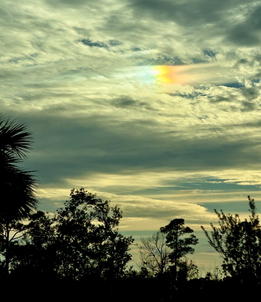 Our good friends in Titusville were down and out with the flu so Denise made a large pot of her world famous cure all chicken soup. We jumped on I 4 as angels of mercy and were treated to a sundog. “Sun dogs are commonly caused by the refraction and scattering of light from horizontally oriented plate-shaped hexagonalice crystals either suspended in high and cold cirrus or cirrostratus clouds, or drifting in freezing moist air at low levels as diamond dust. The crystals act as prisms, bending the light rays passing through them with a minimum deflection of 22°.” “Sun dogs are red-colored at the side nearest the Sun; farther out the colors grade through oranges to blue. The colors overlap considerably and are muted, never pure or saturated. The colors of the sun dog finally merge into the white of the parhelic circle (if the latter is visible)