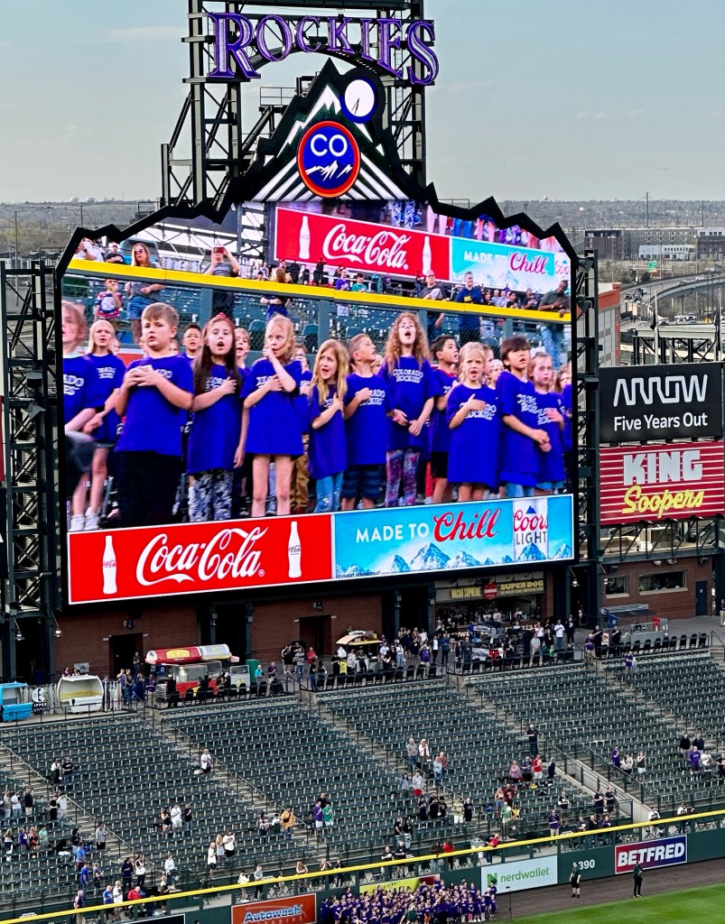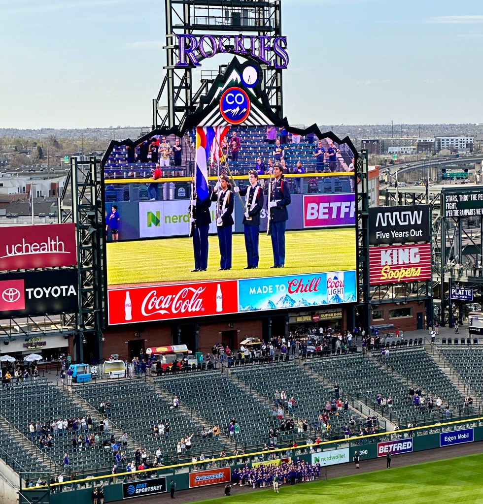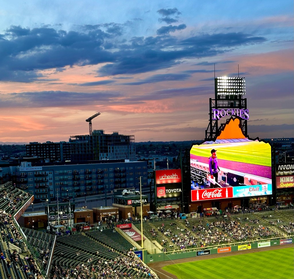 An Air Force Vet and an Army Vet along with our friends watched the Colorado Rockies beat the Milwaukee Brewers on a great night at Coors Field.A local elementary school sang the National Anthem.A local high school’s ROTC made up the Color Guard.Rockies pitcher, Kyle Freeland pitched 5 scoreless innings while striking out 5 Brewers. Sunset at Coors Field, May 3, 2023Good Night Coors Field