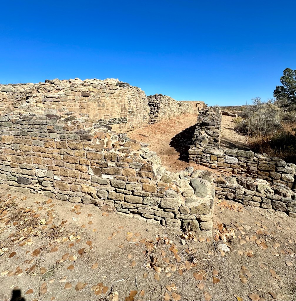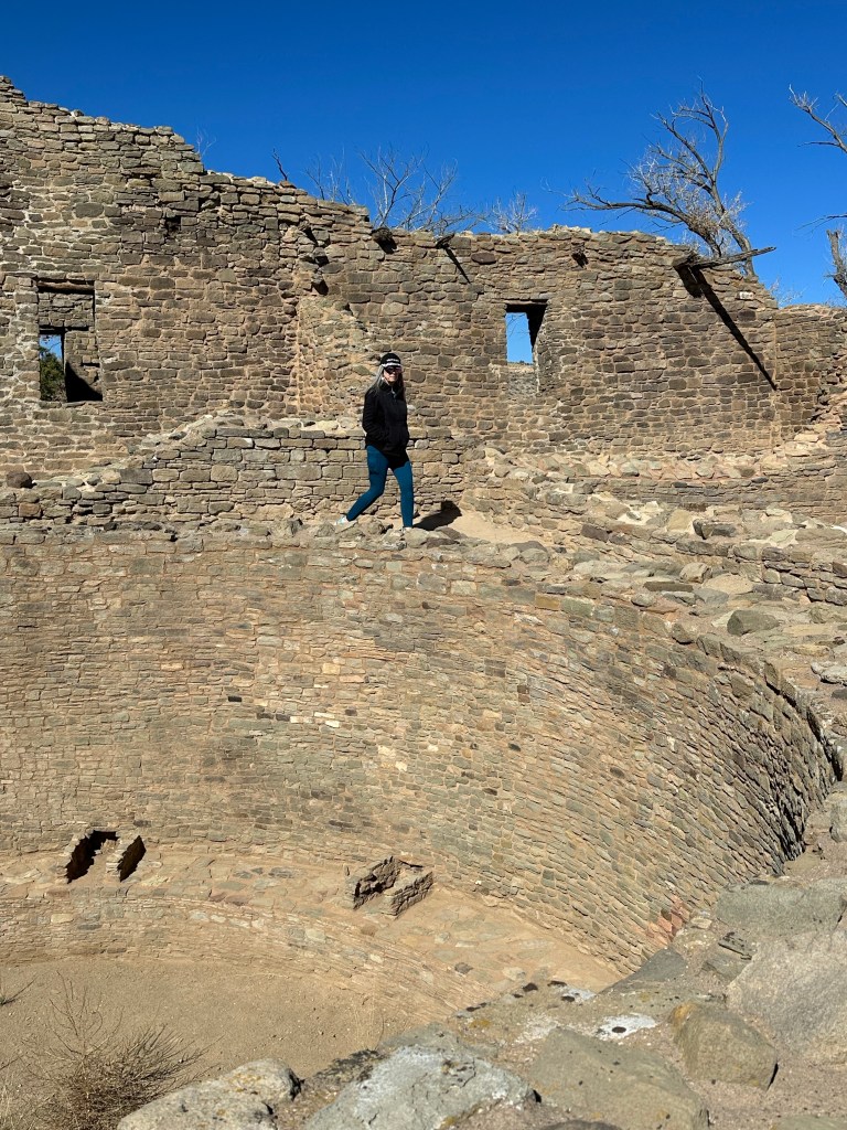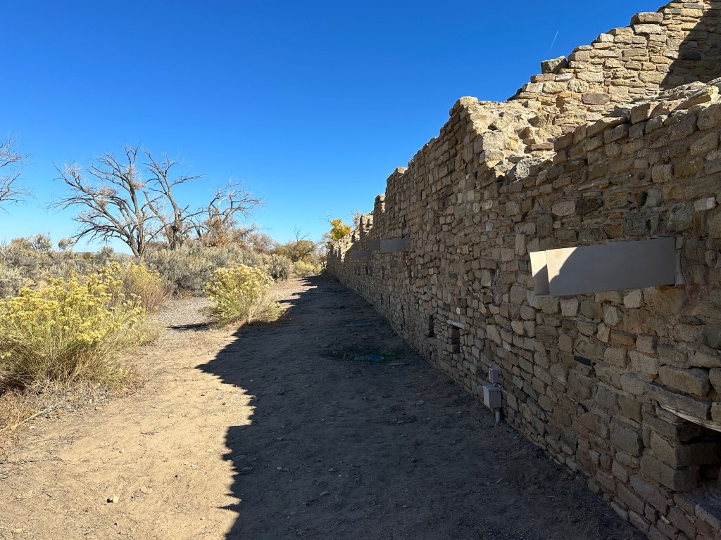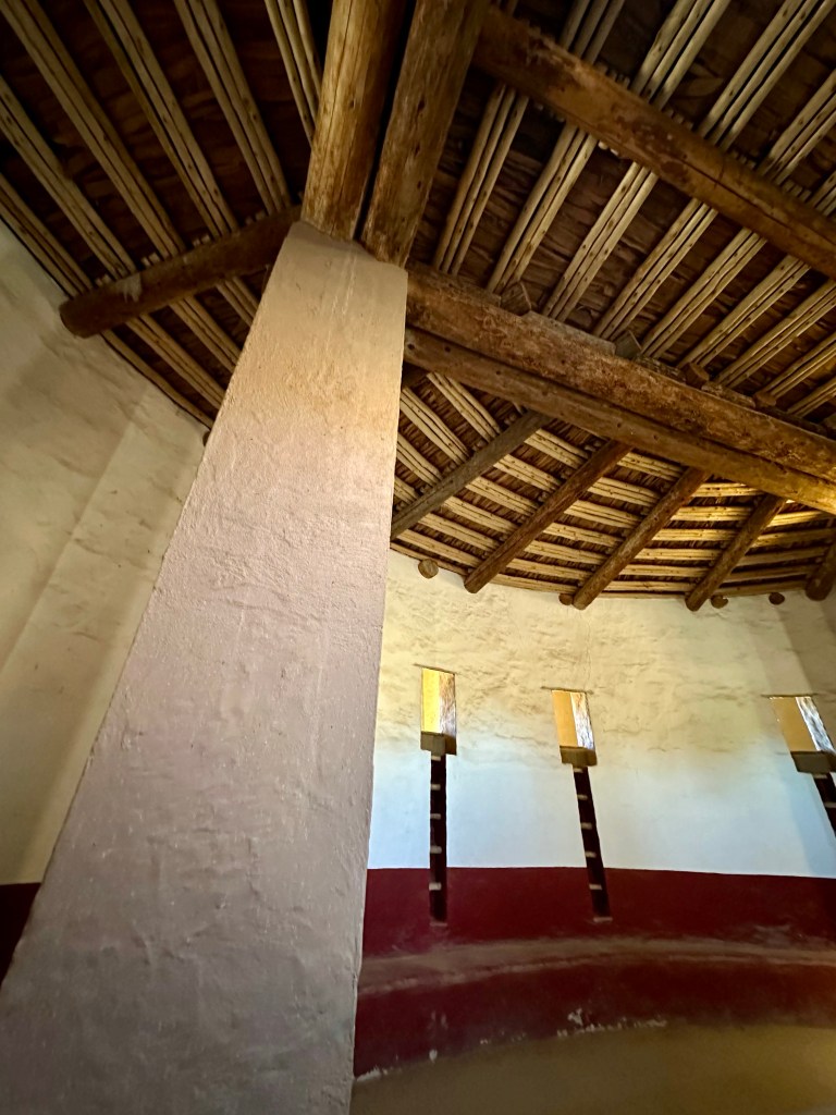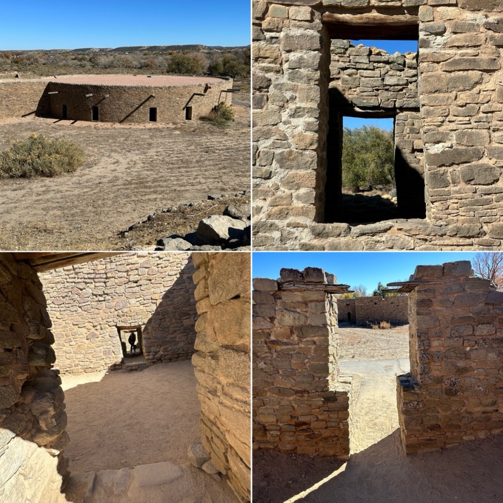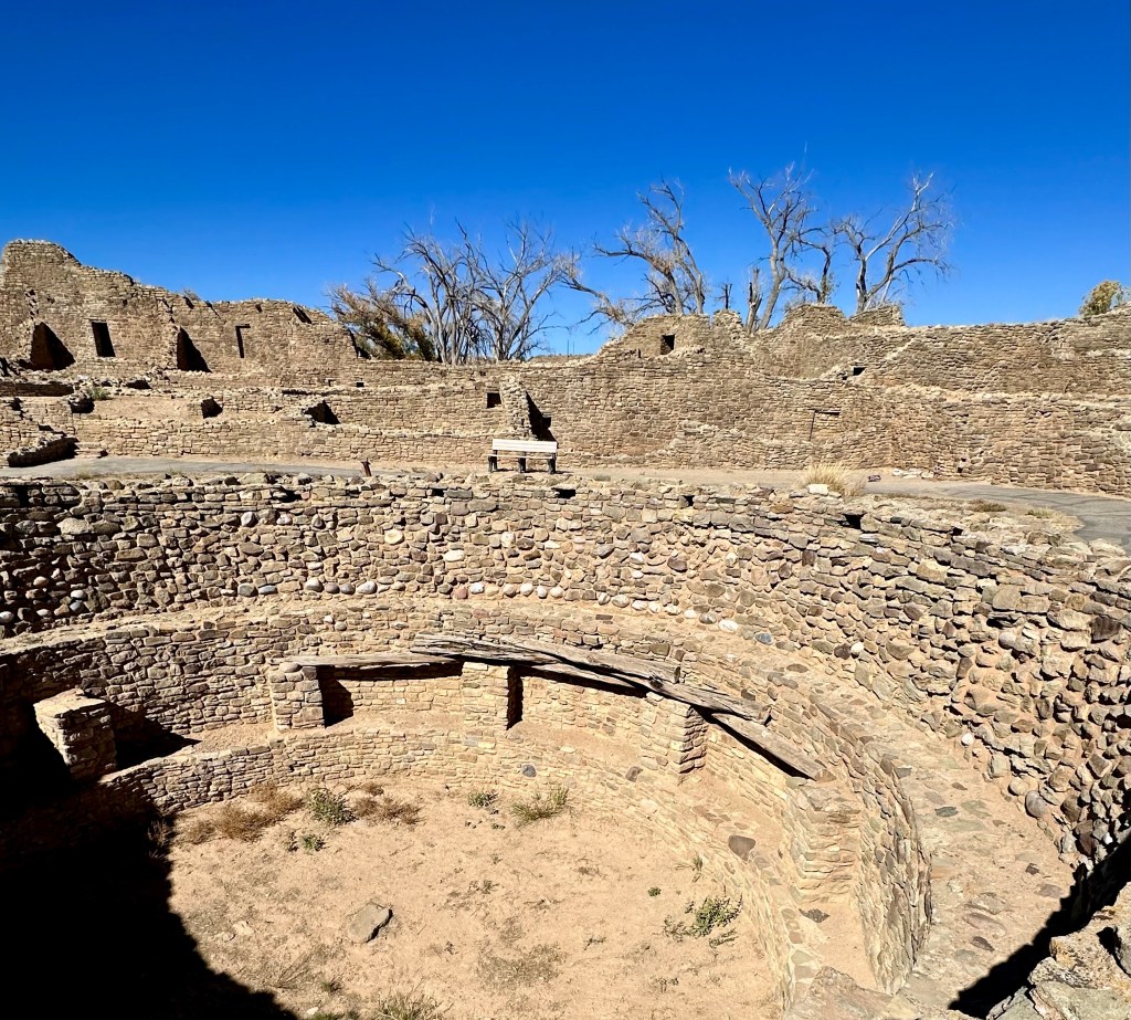 Inside a large community room called a ‘kiva’ “Chaco refers to a place—Chaco Canyon—and to an ancient Puebloan society that developed in that place. Chacoan society arose in an isolated canyon setting without highly visible resources. Chacoans developed ritual-ceremonial system that quickly spread across a large portion of the ancient Puebloan landscape.”“Chacoan leaders managed this society through a sophisticated sociopolitical organization, yet they were not coercive or oppressive. The success of Chacoan society rested primarily on its ability to promote a ritual means of keeping the ancient Pueblo world in balance.”“Chacoans’ “calling-card” across the ancient landscape was their amazing architecture. They built large multistory dwellings known as great houses. Standing up to 50 feet high, with massive three-foot-thick walls, these buildings were visible for miles across the landscape. Great houses incorporated tens of thousands of carefully shaped, tabular sandstone slabs and hundreds of beams of high-elevation wood (pine, spruce, and fir) that had been carried dozens of miles overland from source areas in the mountains.”“On January 24, 1923, President Warren G. Harding established Aztec Ruins National Monument to “…protect an exceptionally well-preserved great house community along the banks of the Animas River, and provide opportunities for greater understanding of the evolution of the Chacoan culture.” In 1987, Aztec Ruins was designated as a United Nations Educational, Scientific, and Cultural Organization (UNESCO) World Heritage Site alongside Chaco Culture National Historical Park and 5 other prominent Chacoan sites managed by the Bureau of Land Management. Though Aztec Ruins National Monument is a relatively small monument, totaling roughly 318 acres, it’s significance to archaeologists, preservationists, visitors, and most importantly, descendants is undeniable. Aztec Ruins is a deeply special place, with some of the best-preserved Chacoan structures of its kind.”The Ancestral Pueblo people used this site for over 200 years. “In its heyday, it contained several multi-story ‘great houses’ – including one which had 500 rooms – as well as plenty of smaller structures. “It was fascinating to fly to a different continent to experience history. And it is just as interesting to learn that at the same time as those societies were building and constructing communities, our own continent was alive with people and amazing activity.