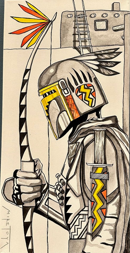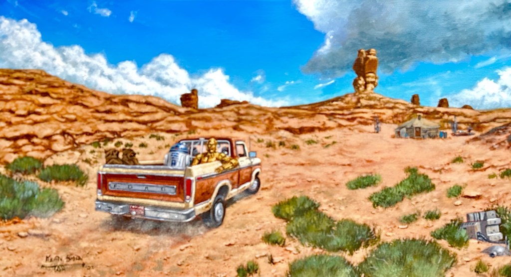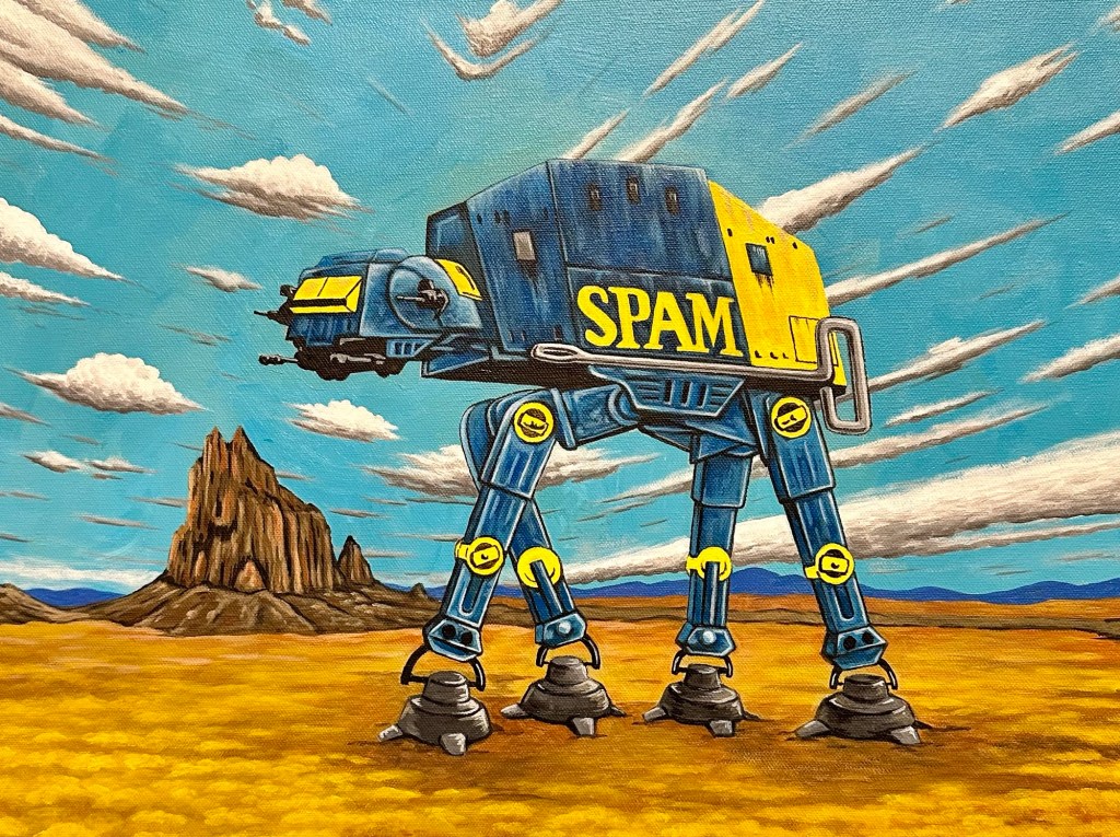 We had the privilege of visiting the latest exhibit at the Fort Lewis College Museum in Durango Colorado.It was an art exhibition featuring the theme of how closely related Indigenous themes are to the themes of the films of Star Wars.Native American artists used their creativity to show Star Wars characters and scenes as seen through the eyes of Indigenous people.Star Wars characters showed up on Native LandsWhy SPAM? This painter said it represents an important staple to Native peoples because some many people did not have refrigerators to store fresh meat.We had a fantastic time walking around such creativity.