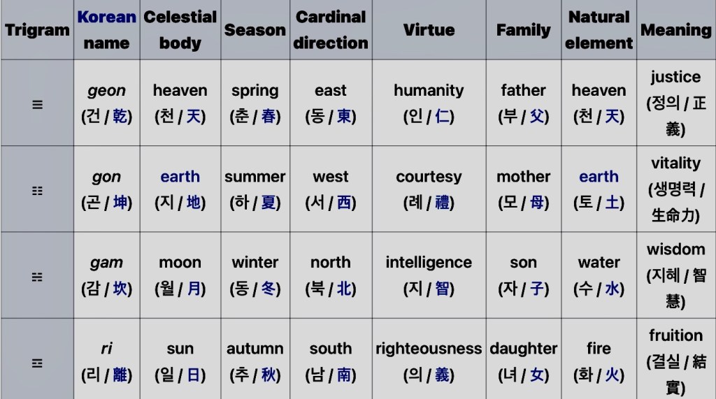 Together, the trigrams represent movement and harmony as fundamental principles. Each trigram (hangeul: 괘 [gwae]; hanja: 卦) represents one of the four classical elements.”