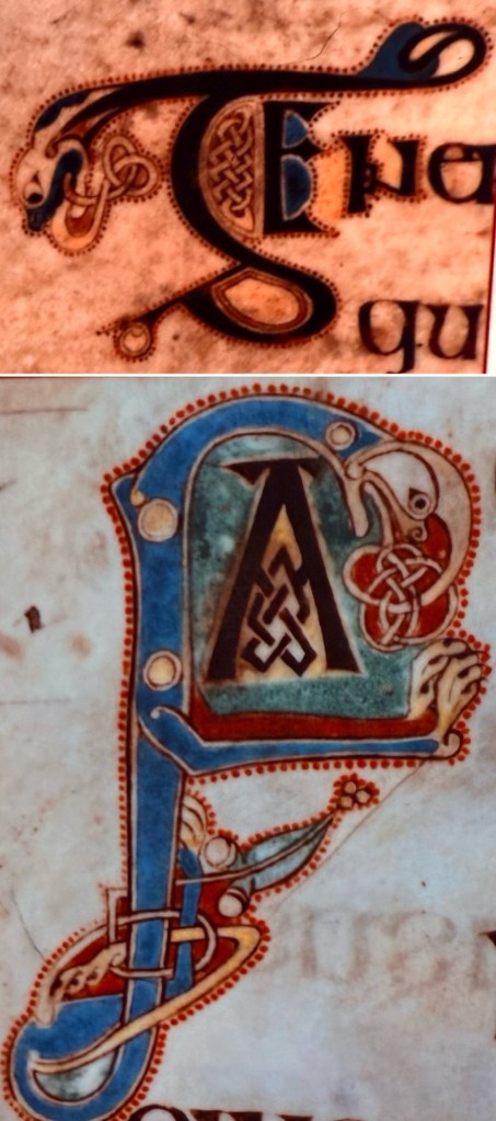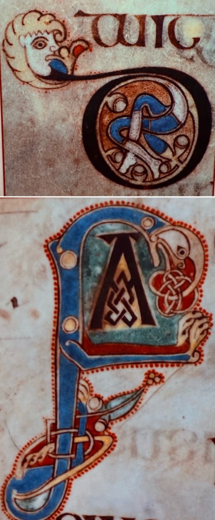The illustrations and ornamentation are extravagant and complex. It might have been the work of only a few monks based on how consistent the lettering is. Fancy swirls containing figures of humans, animals and mythical beasts together with Celtic knots in vibrant colors enliven the manuscripts pages.