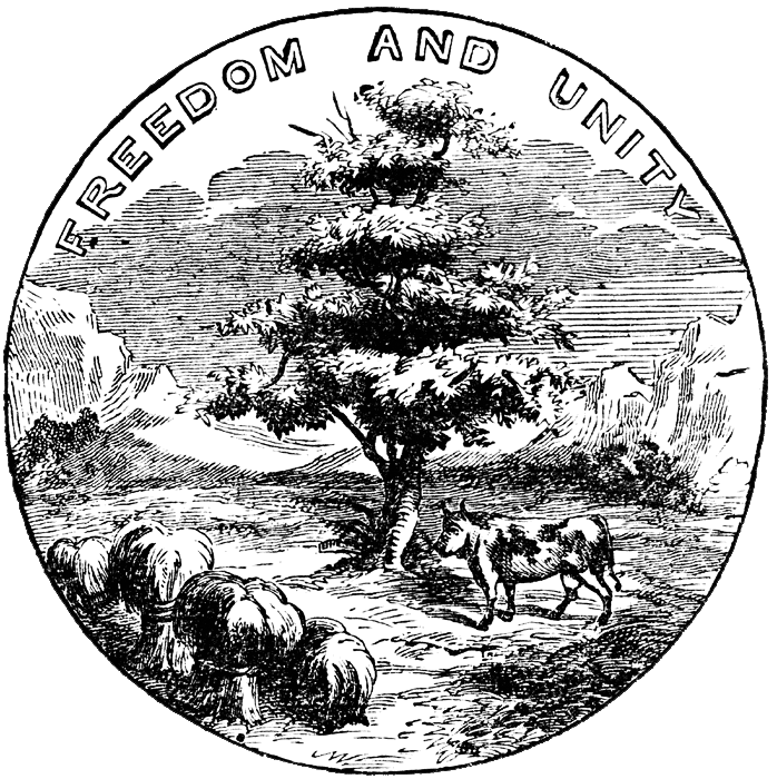 The flag is a blue field with the state seal and motto placed in the center. The seal was designed by Ira Allen, Ethan Allen’s brother. It has a 14 branched pine tree (Vermont is the 14th state). There are two grain sheaths (agriculture) and a cow (dairy farming). The wavy lines above are probably for clouds. On the flag the Green Mountains are in the background. Freedom and Unity is the official motto of the state.