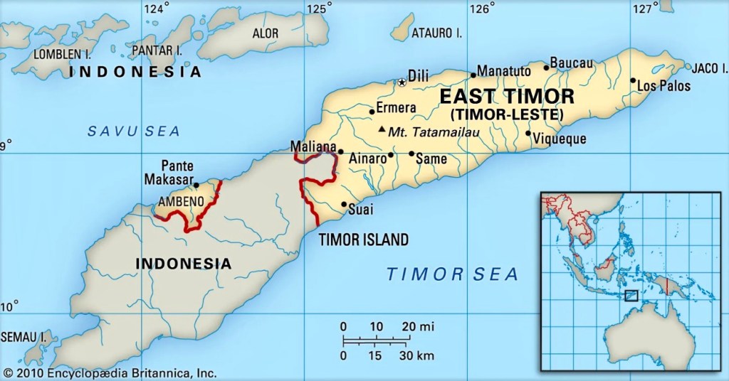 “East Timor, island country in the eastern Lesser Sunda Islands, at the southern extreme of the Malay Archipelago. It occupies the eastern half of the island of Timor, the small nearby islands of Atauro (Kambing) and Jaco, and the enclave of Ambeno, including the town of Pante Makasar, on the northwestern coast of Timor. Dili is the capital and largest city.”