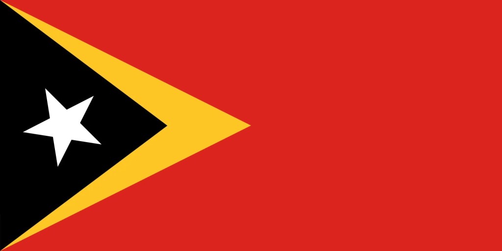 The national flag of East Timor(bandeira nacional de Timor-Leste) consists of a red field with the black isosceles triangle based on the hoist-side bearing a white five-pointed star in the center superimposed on the larger yellow triangle, also based on the hoist-side, that extends to the center of the flag.