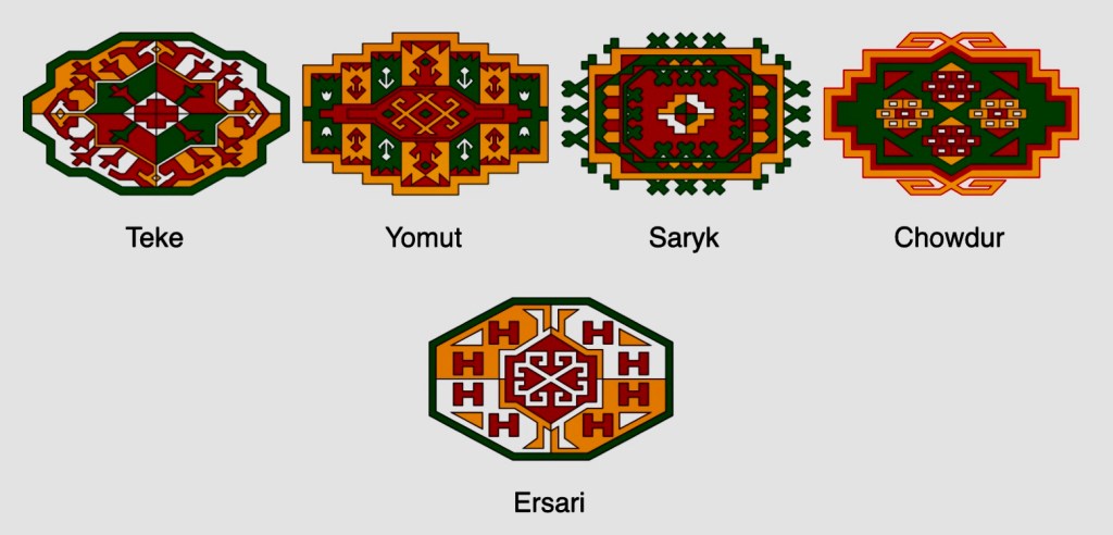 Here is what caught my attention. The five symbols running down the red box near the hoist are carpet ‘gulls’ or symbols woven into the rugs famously produced in Turkmenistan. They stand for the five tribes of the country. I can’t think of another country’s flag that includes carpet samples.