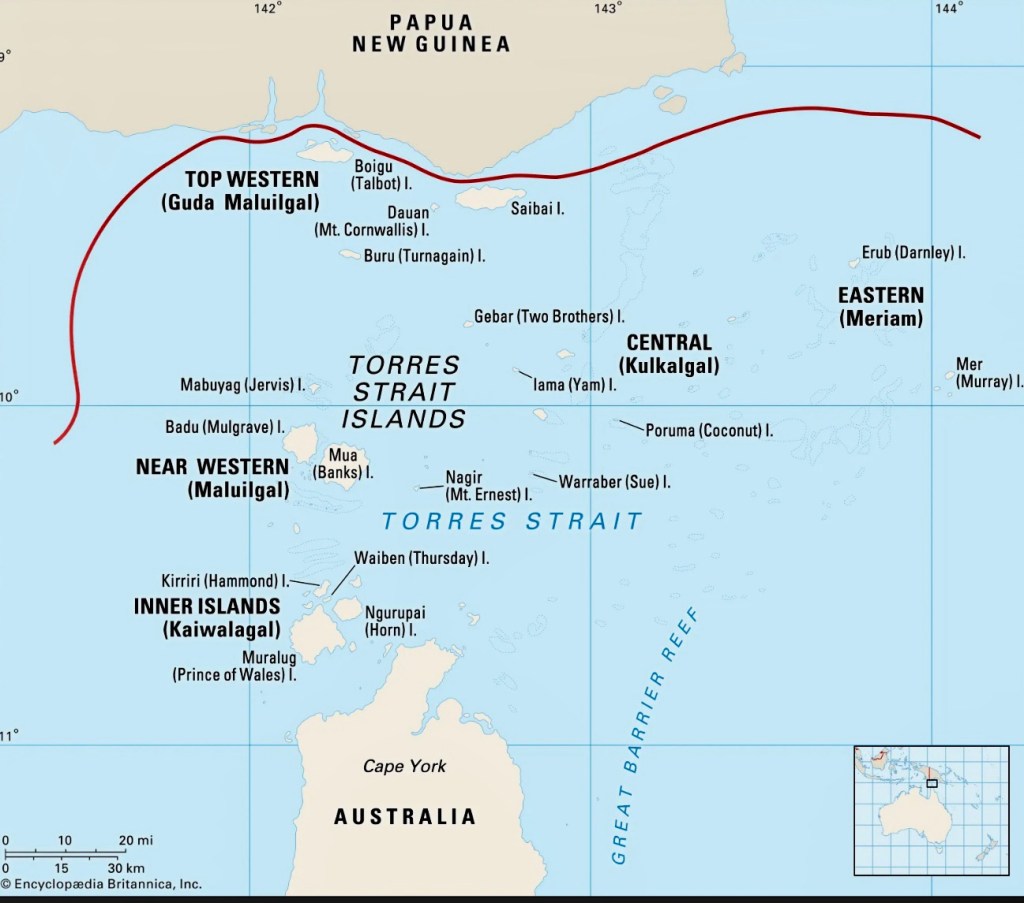 Torres Strait Islands, island group in the Torres Strait, north of Cape York Peninsula, Queensland, Australia, and south of the island of New Guinea. The group comprises dozens of islands scattered over some 18,500 square miles (48,000 square km) of water and organized into four geomorphological clusters: Top Western (low and alluvial, near New Guinea); Western (high, rocky, and barren, the largest being Prince of Wales Island); Central (coral); and Eastern (volcanic, with dense vegetation). Generally rich in offshore coral growth and marine fauna, the islands may be remnants of a land bridge that once linked Asia and Australia. They have been inhabited for at least 2,500 years. The present-day inhabitants are primarily of Melanesian origin, with some mixture of Polynesians and Southeast Asians. Culturally, the Torres Strait Islander peoples are typically divided into five groups: Top Western, Western, Lower Western, Central, and Eastern. The people of the Eastern Islands speak the Meriam Mir language, and those of the Western Islands and Central Islands speak Kala Lagaw Ya or Kala Kawa Ya, which are dialects of the same language.