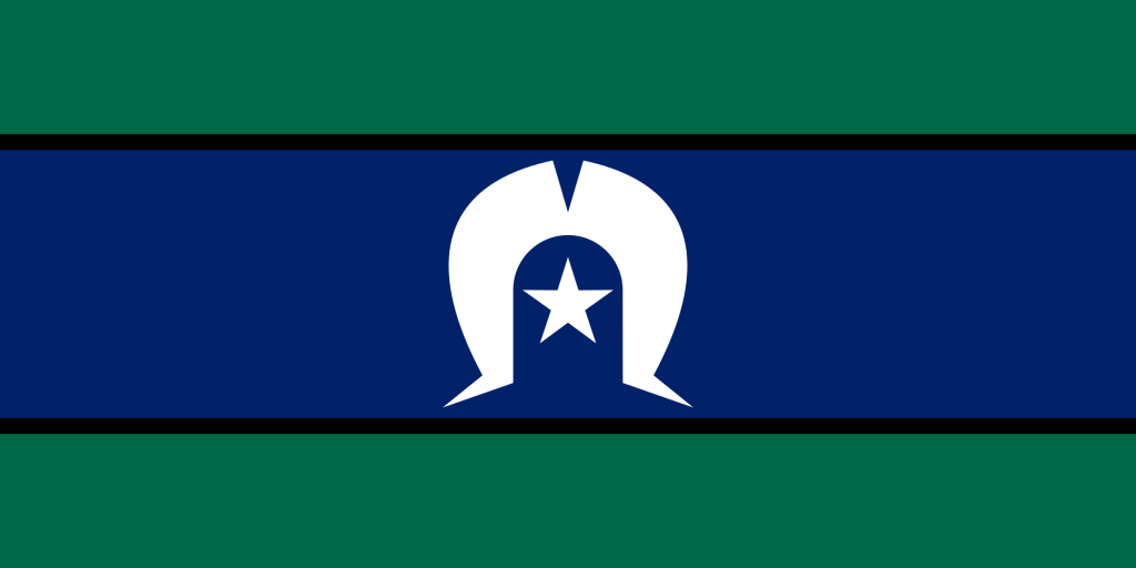 The green panels at the top and the bottom of the flag symbolise the land, while the blue panel in the centre represents the waters of the Torres Strait. The thin black stripes between the green and blue panels signify the Torres Strait Islanders themselves. The white five-pointed star at the centre of the flag represents the five major island groups—the Western, Eastern, Central, Port Kennedy and (N.P.A.) Mainland—and the white dhari (also spelt dari, a ceremonial dancer’s headdress around it also symbolises the Torres Strait Islands people. White symbolises peace, while the star is a symbol for navigation.