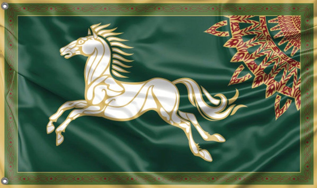 The realm just to the north of Gondor. It is known as the ‘Kingdom of The Horsemen’ for its famous cavalry. The flag of Rohan, home to The Rohirrim.