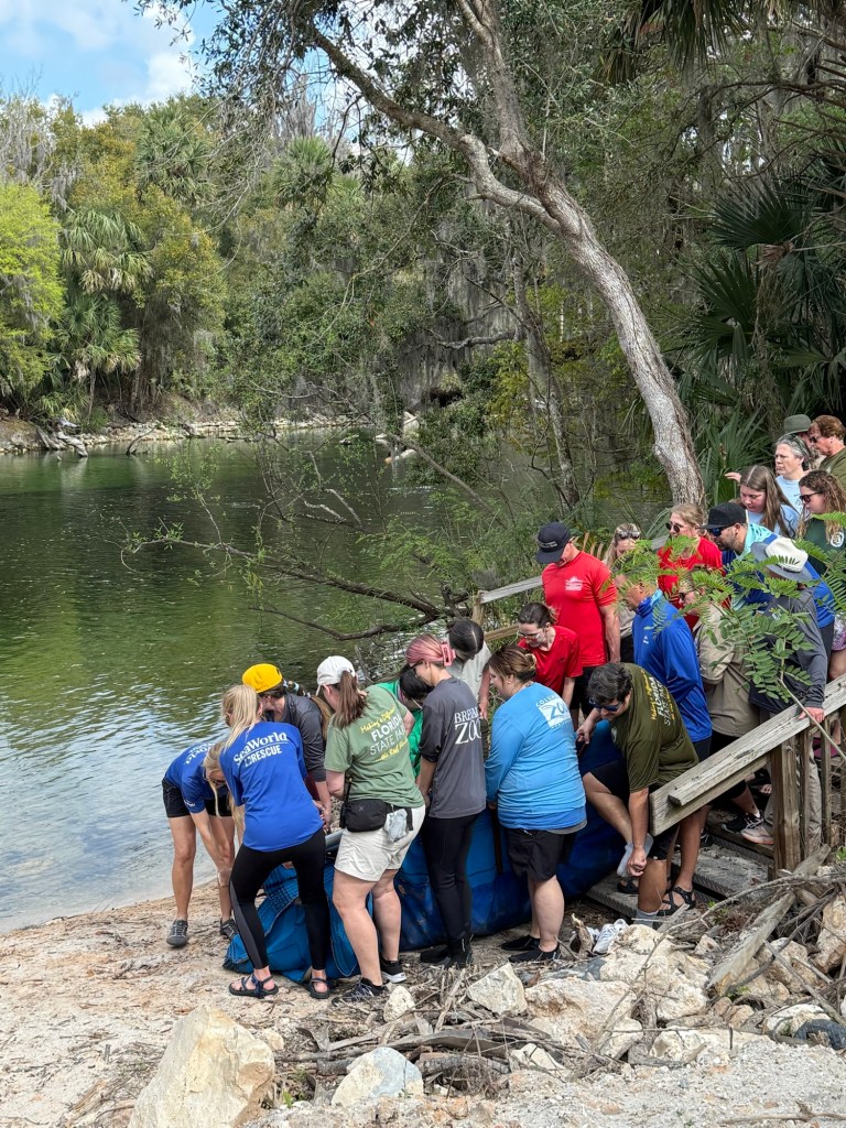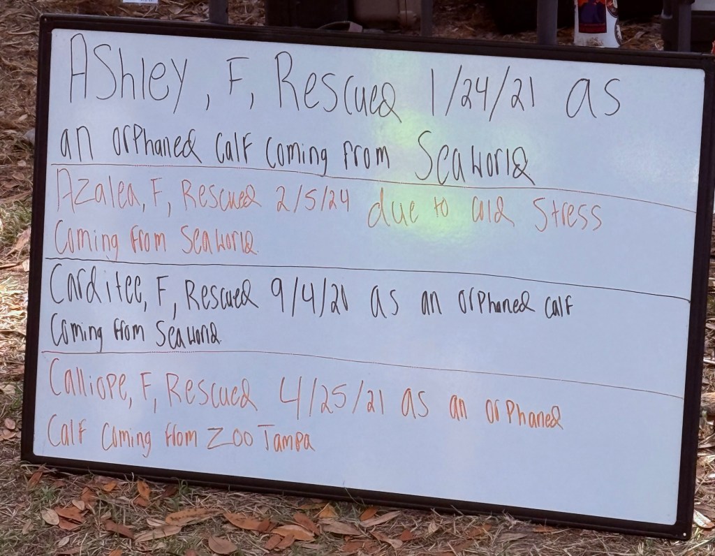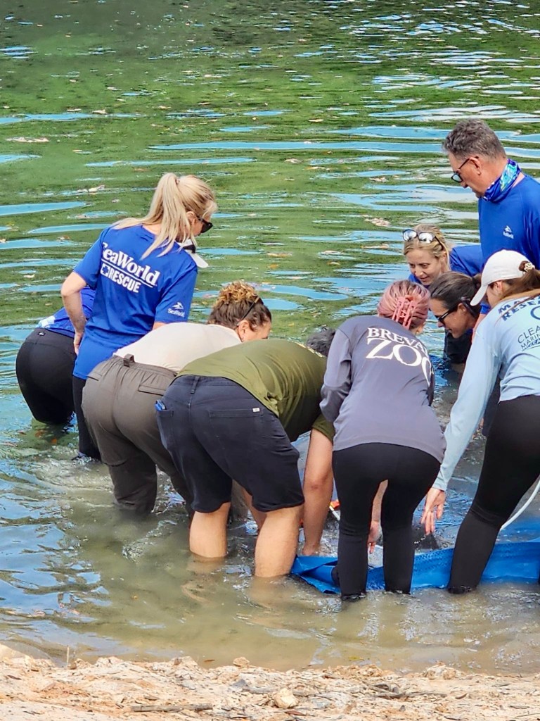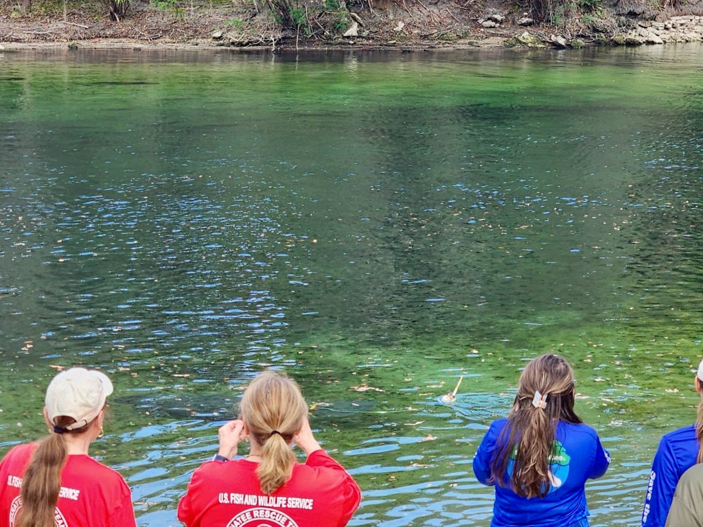 After the crew carried Calliope down those steps she is released in Blue Spring. If you look closely just to the left of the young lady in the blue shirt you can see Calliope’s tracking monitor bobbing in the water.
