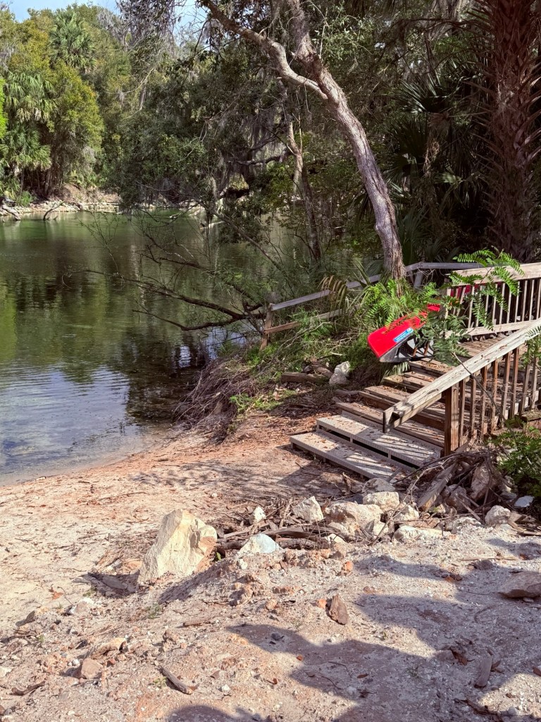 At the moment the path to the water involves 7 steps. The Blue Spring Volunteer group has raised the funds to construct a concrete path with no steps. Work on the new ramp begins within a week. (Hooray for Volunteers.)