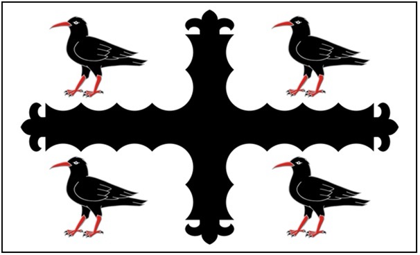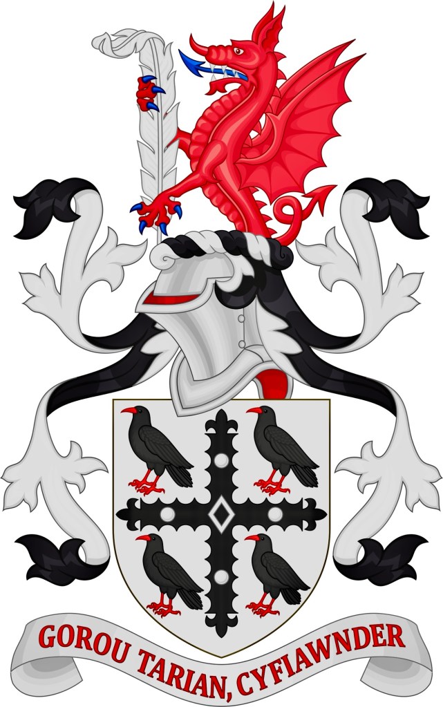are attributed to the local 11th century ruler, Edwin of Tegeingl, a Welsh “cantref” and sometime kingdom, that covered much of the territory of Flintshire. They feature a black engrailed, flory cross on a white field, between four choughs, a bird once likely to have been widespread in the vicinity, in black and red. The bird occupied a symbolic place in Welsh cultural tradition and according to the 18thcentury Welsh naturalist Thomas Pennant once flourished on the limestone range which runs along part of Flintshire’s coast, M.P. Siddons, in his 1993 work The Development of Welsh Heraldry, Vol. II reports that the arms first appear in the 14thcentury, on a seal used in 1389 by one ‘Le Grand Ithel’, a Flintshire soldier and probable descendant of Edwin who captained a body of Welshmen in the service of the French king during the Hundred Years War.