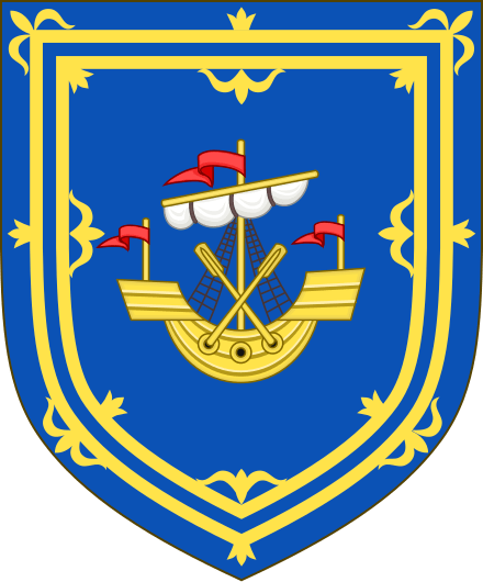 Argent, (In heraldry it is the tincture showing silver or white), a cross in Scandinavian form (from the Nordic influence of it’s history) surmounted by a saltire sable (A saltire is also called Saint Andrew’s Cross) (Sable is the tincture showing as black) charged at the centre point with an eight-pointed star or (an or is a tincture of gold)