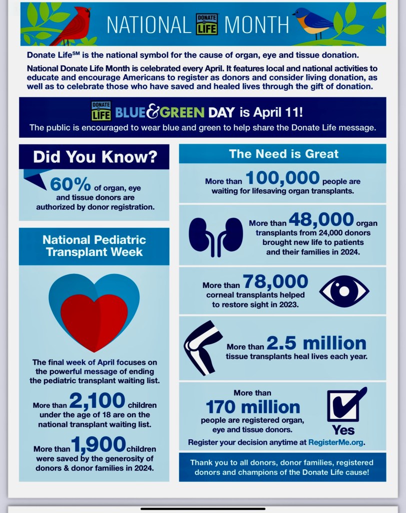 April is National Donate Life Month. I fly a flag honoring the amazing people who made the decision to give the ultimate gift.