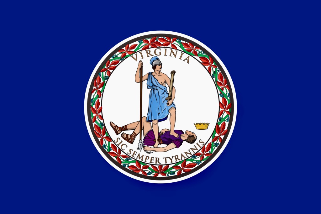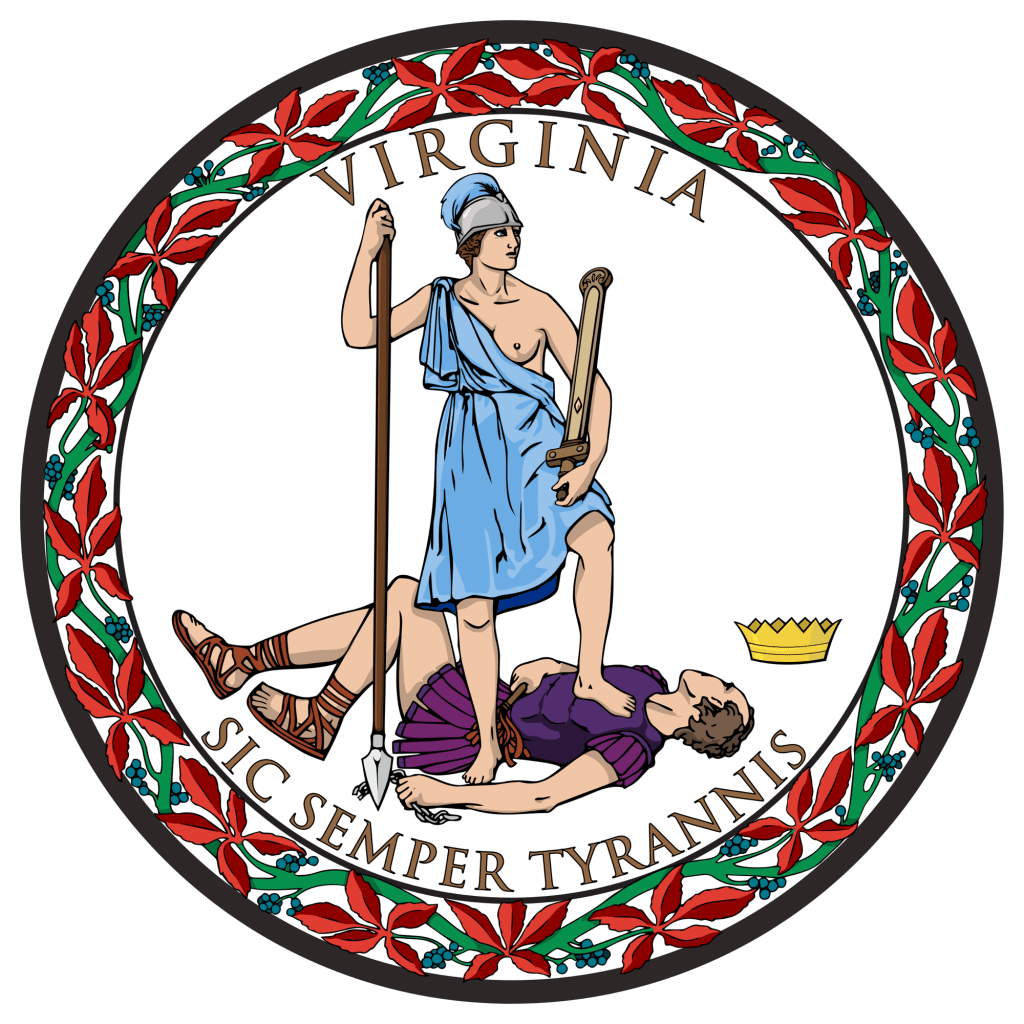 Back to the flag – The leaders of the state did not want a flag that paid any homage to the king, or any king so they chose more of a Latin theme with the depiction of an Amazon warrior. Tyranny lies supine beneath the foot of Virtus, symbolizing Great Britain‘s defeat by Virginia. The royal crown which has fallen to the ground beside him symbolizes the new republic‘s release from the monarchical control of Great Britain.