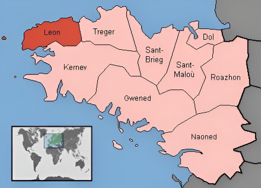 Pays de Leon (The County of Leon) “a feudal state [Feudalism, also known as the feudal system, was a combination of legal, economic, military, cultural, and political customs that flourished in medieval Europe from the 9th to 15th centuries. Broadly defined, it was a way of structuring society around relationships derived from the holding of land in exchange for service or labour] in extreme western Brittany in the High Middle Ages (1000 – 1300 BC) Though nominally a vassal of the sovereign duke of Brittany,