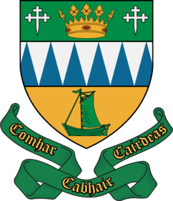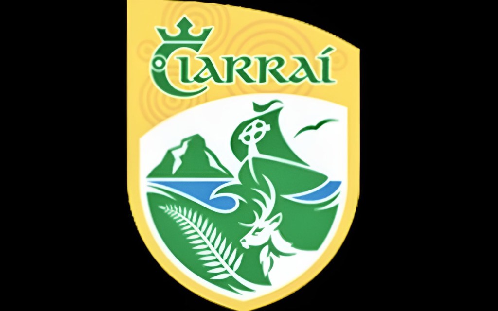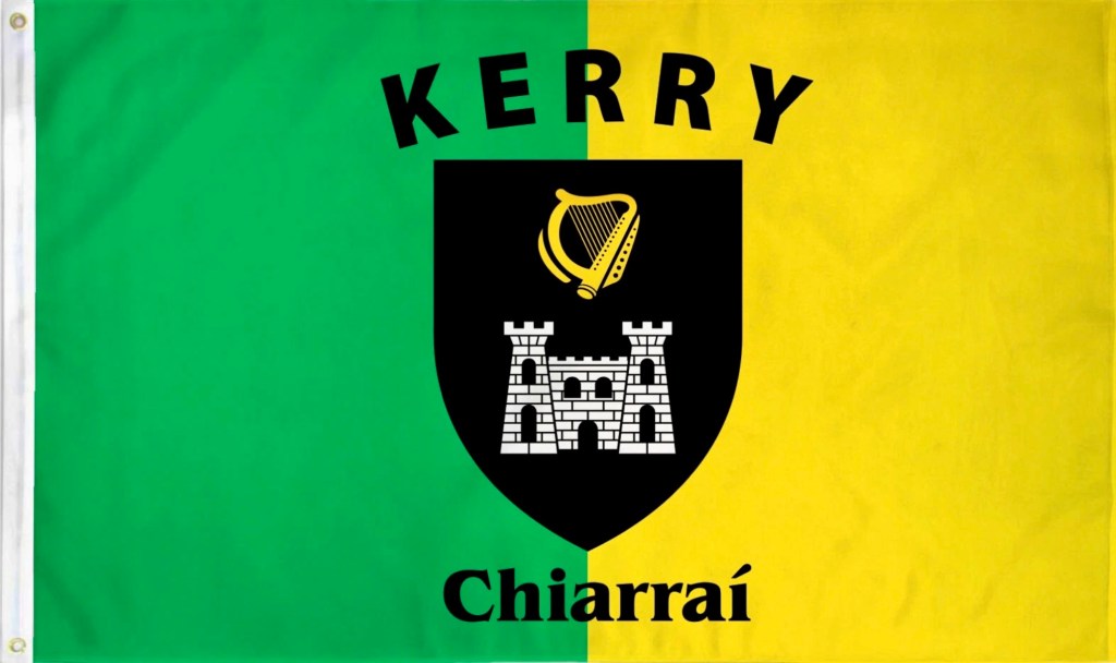Back to the flag: A green and yellow background with the words Kerry on the top and Chiarrai, which is County in Irish,on the bottom. In the middle is a crest containing a harp and a castle.