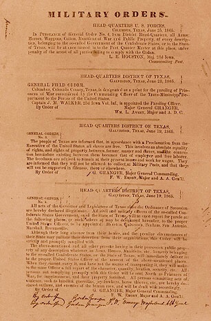“The people of Texas are informed that, in accordance with a proclamation from the Executive of the United States, all slaves are free. This involves an absolute equality of personal rights and rights of property between former masters and slaves, and the connection heretofore existing between them becomes that between employer and hired labor. The freedmen are advised to remain quietly at their present homes and work for wages. They are informed that they will not be allowed to collect at military posts and that they will not be supported in idleness either there or elsewhere.”