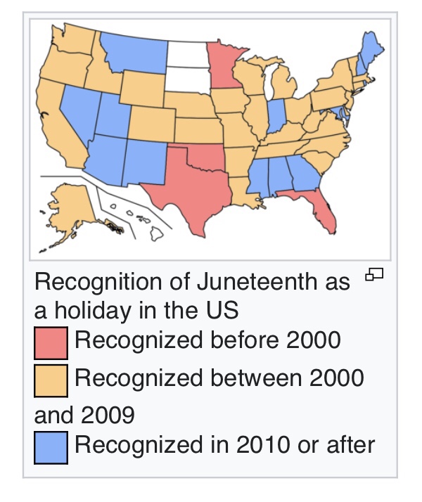 Modern day celebrations have begun to ‘pick up steam’. As Isabel Wilkerson points out – as people migrated from the south to large urban centers they brought Juneteenth with them. (Hawaii and South Dakota are the only states to not recognize Juneteenth)