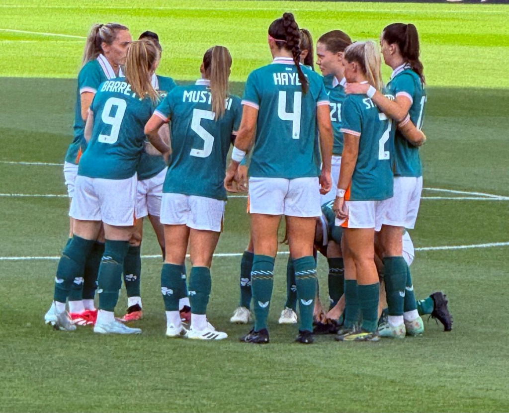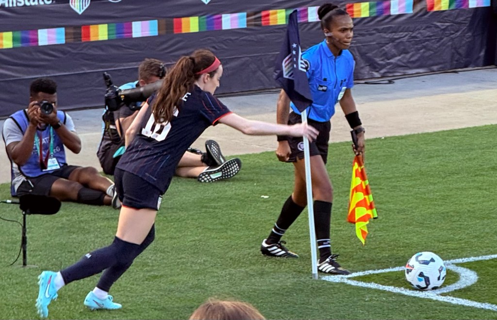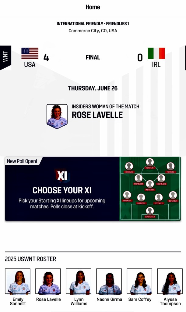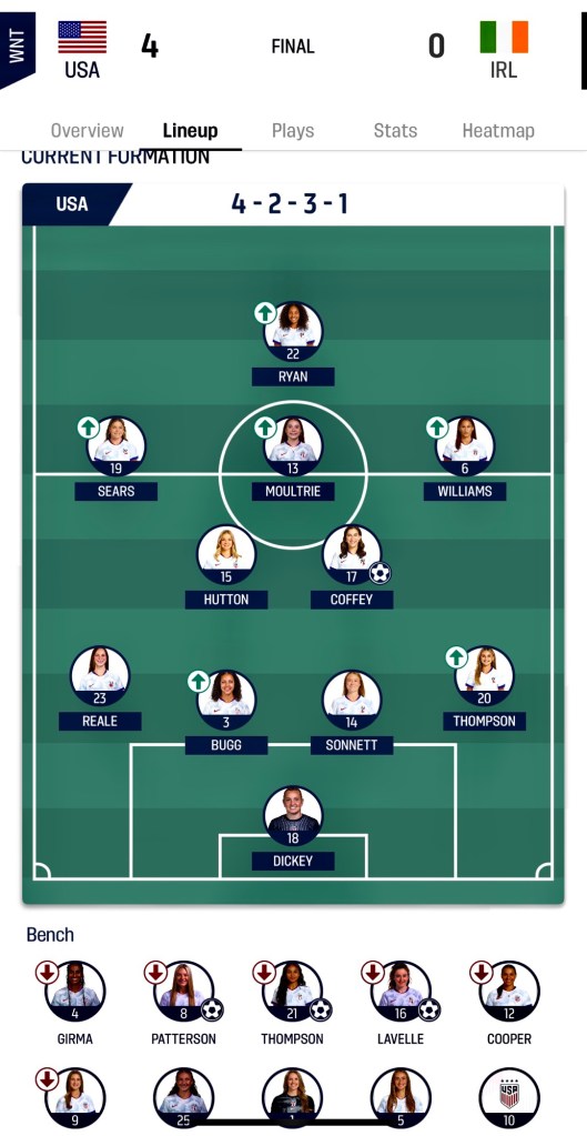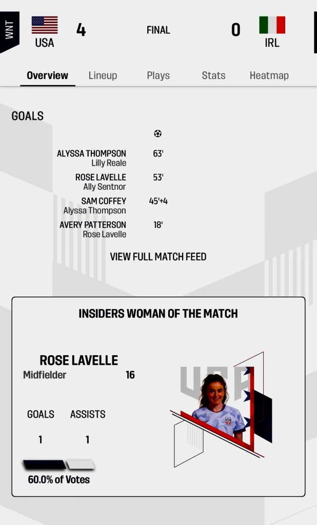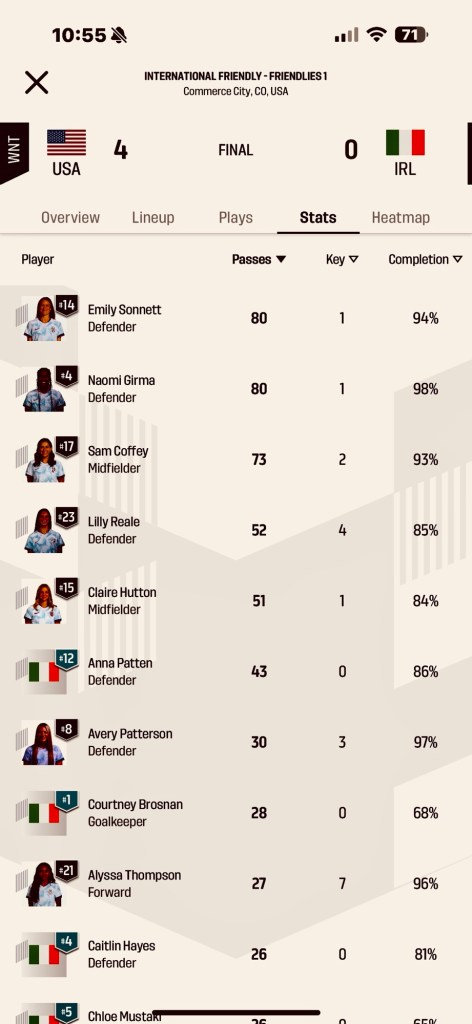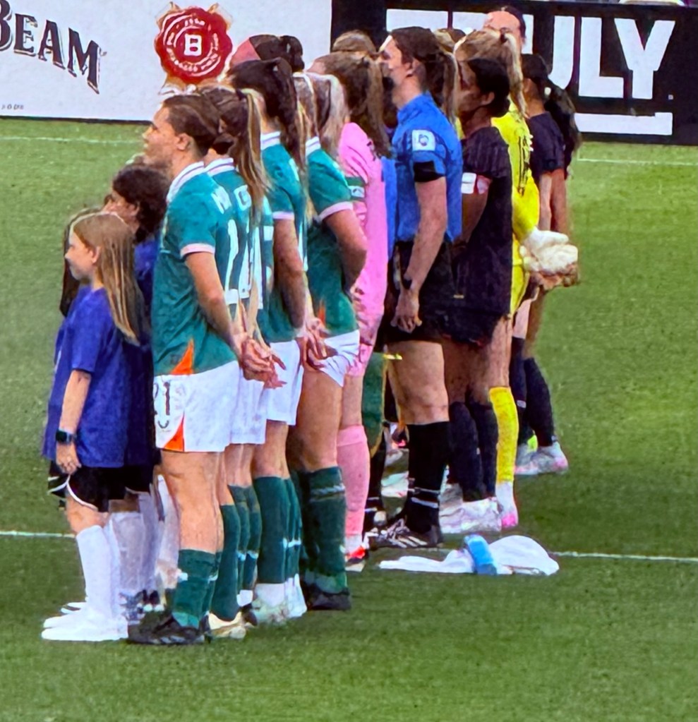 Teams file in with all the pomp and ceremony The IrishCamera man (Televised nationally)Lots of action as the US dominated the matchMy favorite player, Rose LavelleAlyssa Thompson scored,the fourth goal. A fun match and we were there.
