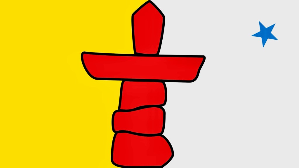 The official flag, also created in 1999 ‘consists of gold and white fields divided vertically by a red inuksuk with a blue star in the fly. The colours blue and gold were selected to represent the “riches of land, sea, and sky”, while red is used to represent Canada as a whole. The inuksuk, which divides the flag, is a traditional stone monument used to guide travellers and to mark sacred sites. In the upper fly, the blue star represents the North Star (Niqirtsituk / Niqirtsuituq), an important object due to its key role as a navigational beacon, and as symbolically representing the wisdom and leadership of community elders.’