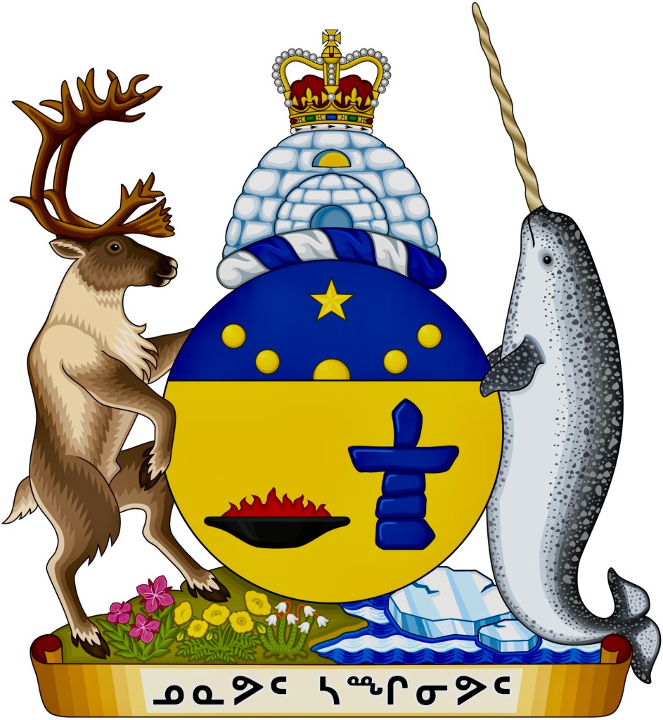 Created by Inuit elders, leaders artists and general population. The shield is blue and gold symbolizing the riches of the land. The main section is rounded rather than a traditional English square. The igloo is still under the crown showing Nunavut’s membership in the Commonwealth. On each side is a Dexter caribou and a narwhal, representing the sustenance of the territory. Inside the main section is a stone lamp representing the warmth of home and a stone guidepost (an inukshuk) symbolizing the boundaries of the territory.