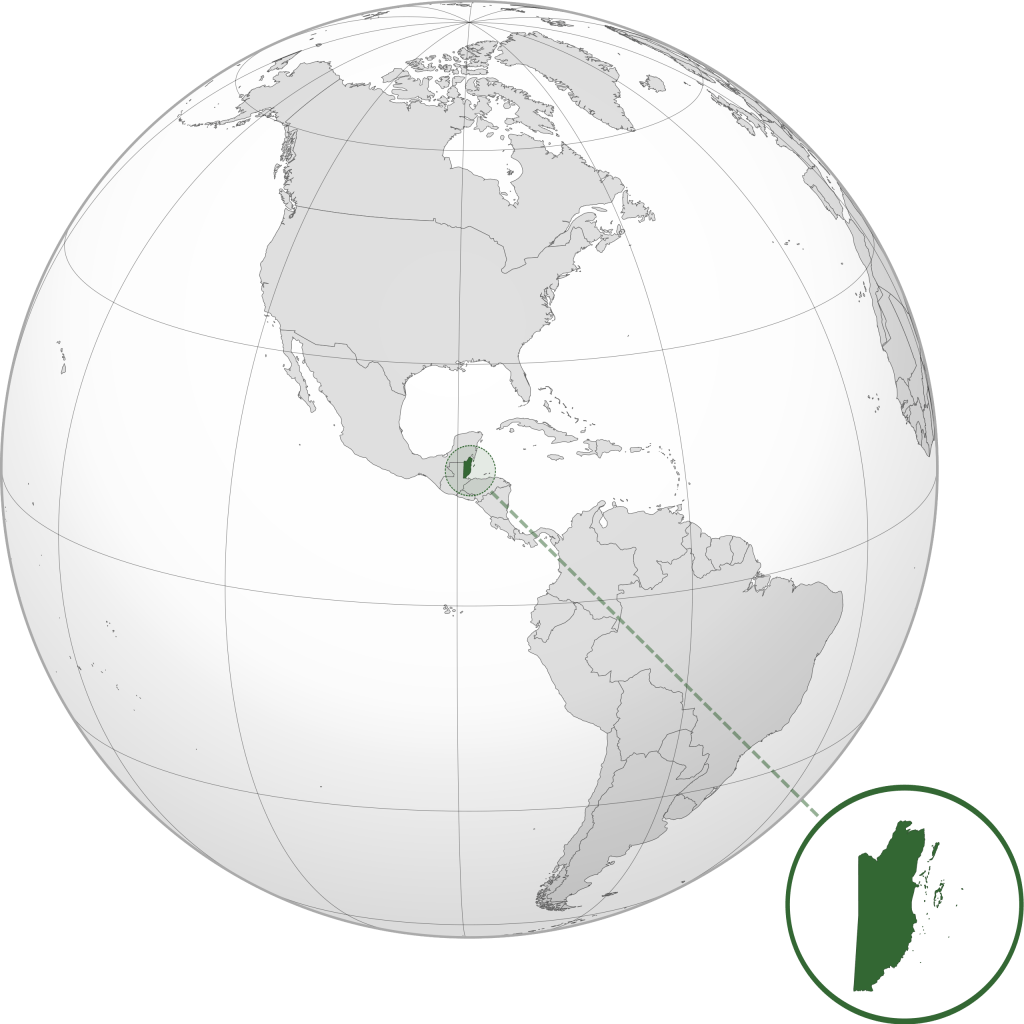 The flag of Belize. A Caribbean country on the north east coast of Central America. Mexico is to the north, the Caribbean Sea is to the east with Guatemala to the south. It was formerly known as British Honduras.