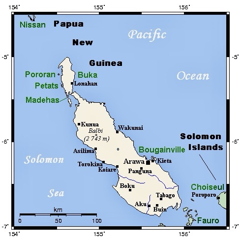 Bougainville is the largest island in the Solomon Islands archipelago. It was previously the main landmass in the German Empire–associated North Solomons. Most of the islands in this archipelago (which are primarily concentrated in the southern and eastern portions of it) are part of the politically independent Solomon Islands. Two of these islands—the closely connected Shortland Islands—are less than 9 km (5.6 mi) south or southeast of Bougainville, and about 30 km (19 mi) west of Choiseul, one of the settlements of which, Poroporo, faces Bougainville.