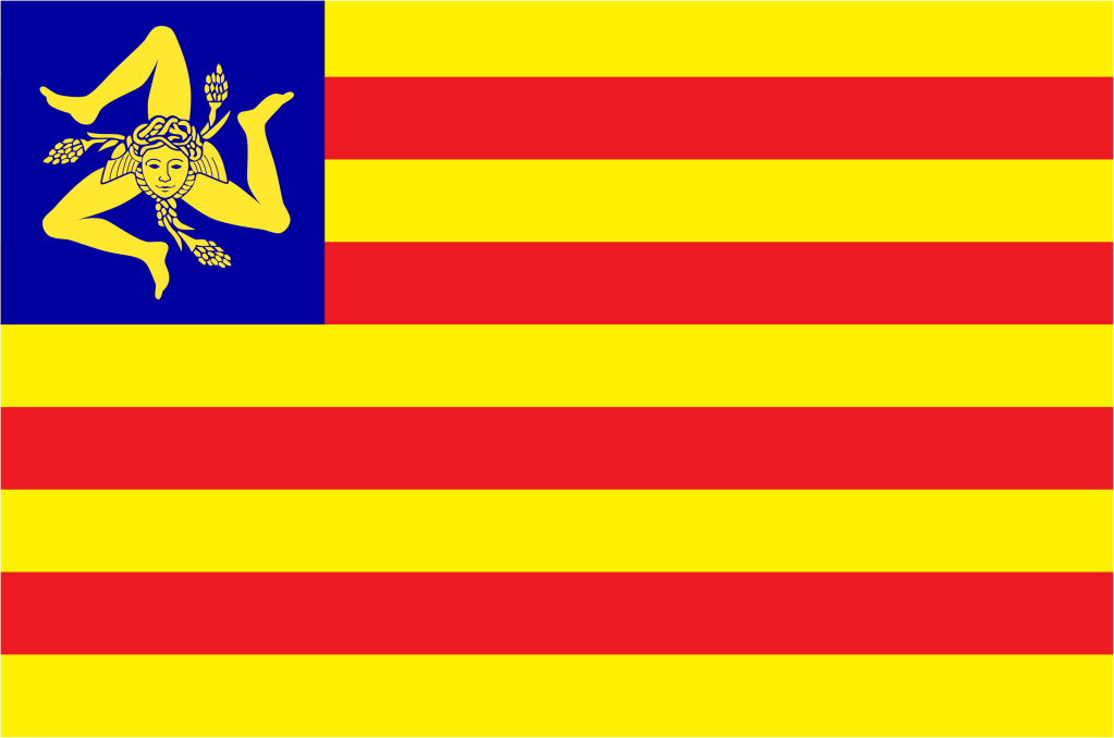 The flag has a unique design. It features the Triskeles: a winged head of Medusa with 3 wheat ears (wheat representing the extreme fertility of the land), with 3 legs rotating around Medusa’s head (each leg standing for one of the points of the island: Pelorus, Pachynus and Lilybaeum). The flag is bisected diagonally into red (Palermo) and yellow (Corleone).