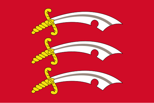 Back to the flag. Both the flag and the coat of arms feature three white Saxon sea knives (although they look rather more like scimitars) pointing to the right (from the point of view of the observer), arranged vertically one above another on a red background. The three-seax device is also used as the official logo of Essex County Council; this was granted in 1932.