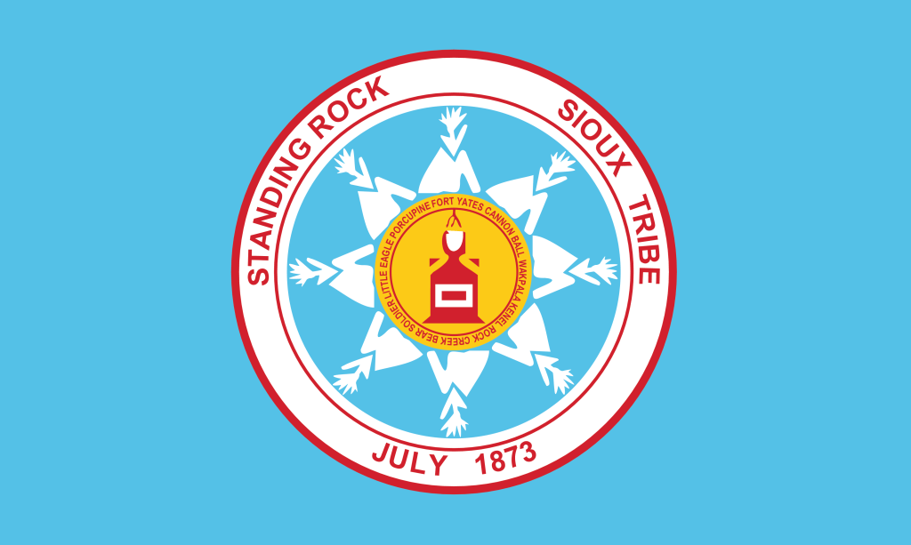 The flag is a medium blue field with the tribal seal in the center. The seal’s outer ring is white edged by two narrow red bands and bears the words “STANDING ROCK SIOUX TRIBE” in red above and JULY 1873 below. The circle of eight tipis represent the eight districts of the reservation on a red background. The ring of the outward-pointing tipis encloses a yellow disk depicting the Standing Rock in white on it’s red pedestal. Around the disk are the names of the eight districts in red: Fort Yates; Cannonball; Wakpala; Kernal; Rockcreek; Bear Soldier; Little Eagle and Porcupine.