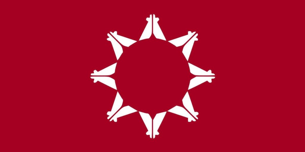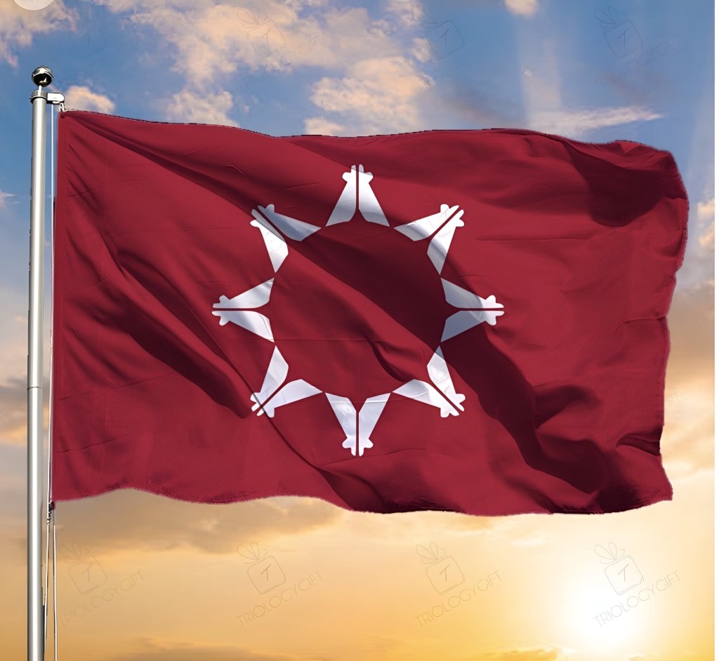 The red field symbolizes the blood shed by the Sioux in defense of their lands and the very idea of the ‘red people’. A circle of eight white tipis (tops pointing outward) represents the eight districts of the reservation: Porcupine, Wakpamni, Medicine Root, Pass Creek, Eagle Nest, White Clay, Lacreek, and Wounded Knee.