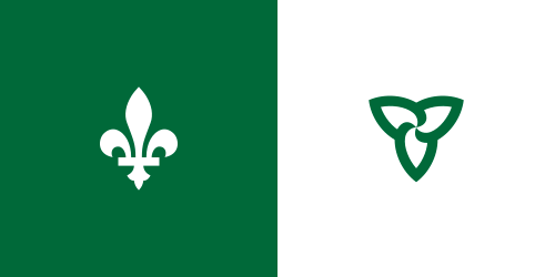 The Franco-Ontarian flag is a symbol created to represent Franco-Ontarians, reflecting the diverse languages, seasons and people of Ontario. The design consists of two bands of green and white. The left portion has a solid light green background with a white fleur-de-lys in the middle, while the right portion has a solid white background with a stylized green trillium in the middle.