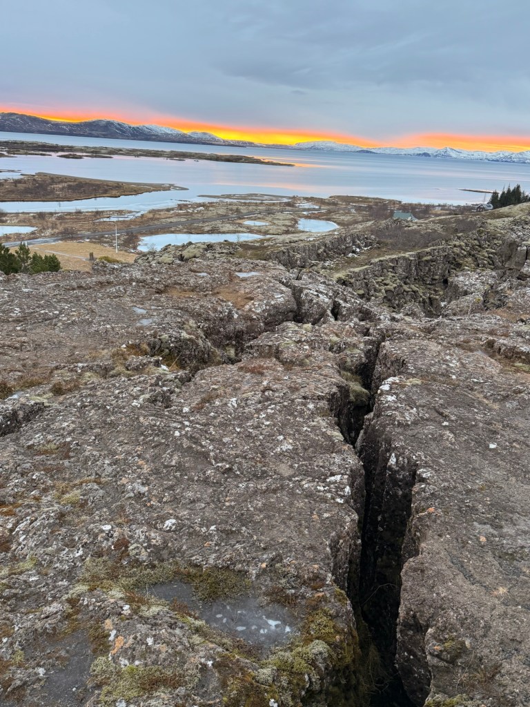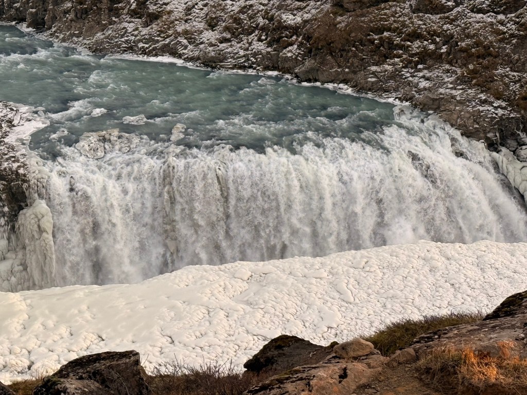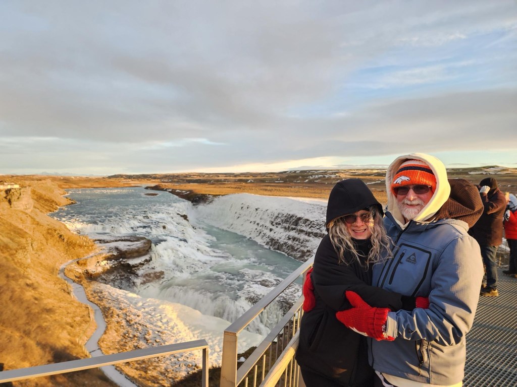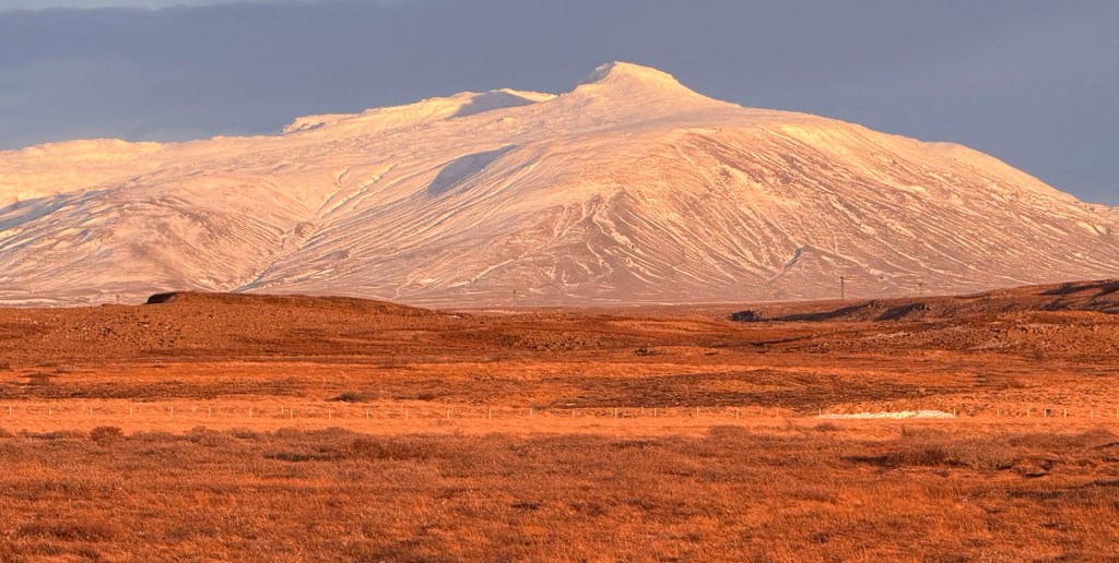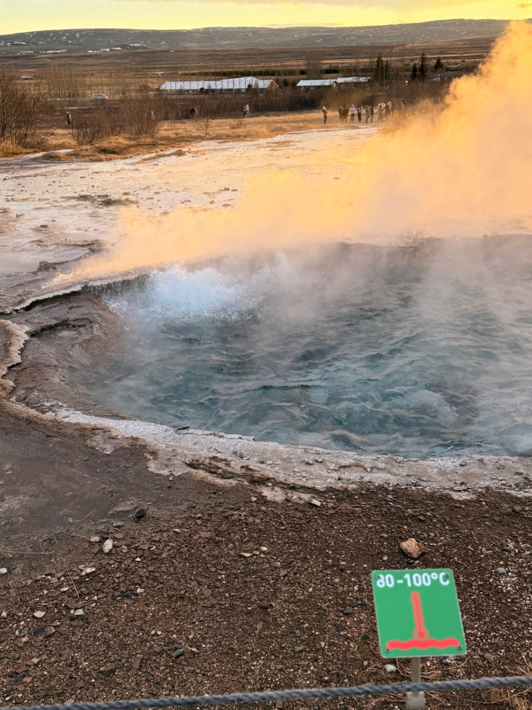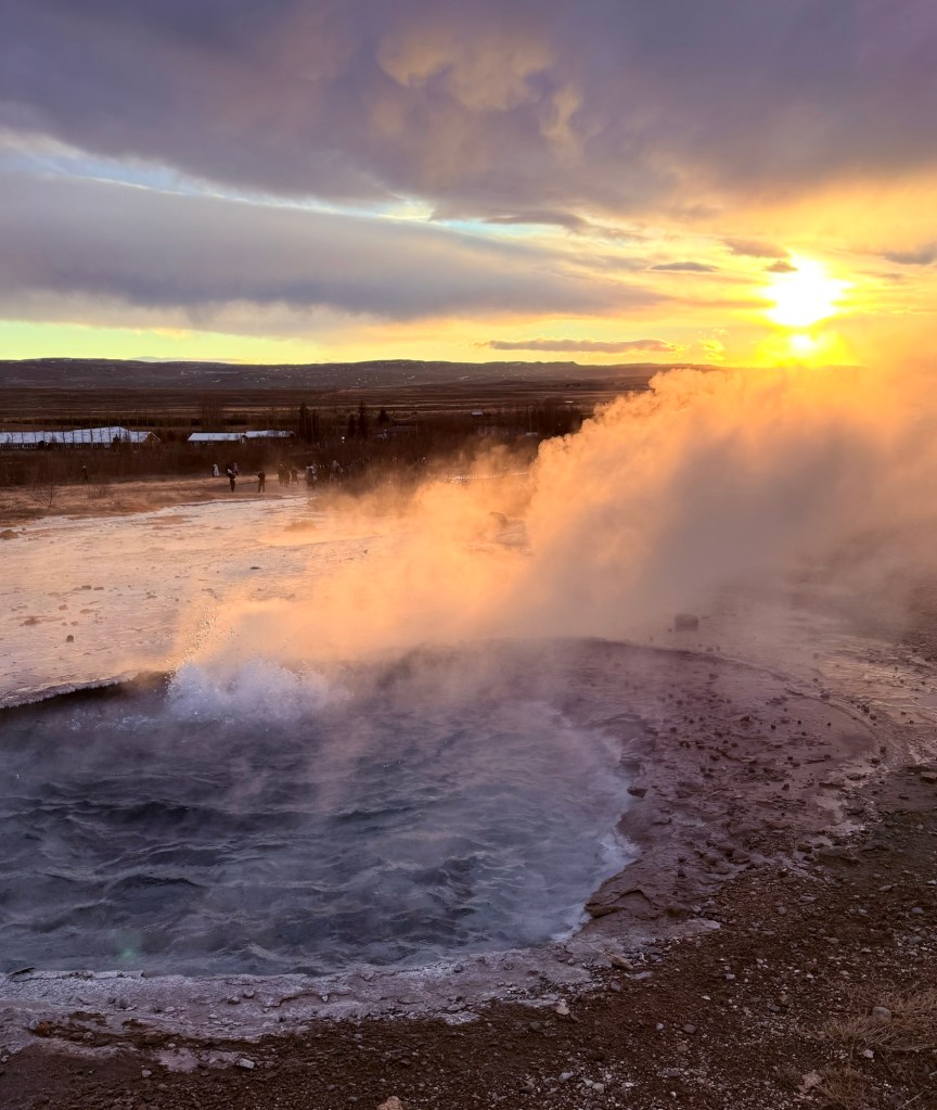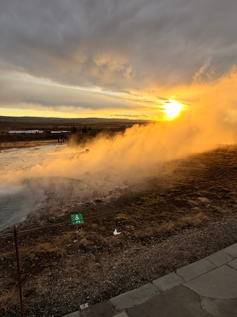 Arriving in Reykjavik at 6:00 am it remained darker than the inside of a cow until 11:00 am. At 11:10 the sun began a slow dawning. Shot taken at Thingvellir National Park.The number two island in the world for volcanic activity. (The number one island is Kona, Hawaii.)Geothermal activity at Geysir Geothermal Area. Iceland is the world’s leader in geothermal energy production. It bubbles up extremely hot in so many areas. Every single building, homes, businesses, etc are heated by geothermal energy piped everywhere on the island. The largest and most volume of any waterfall in Europe: Gullfoss Waterfall.The water in Gullfoss comes from nearby glaciers. Slightly fuzzy because I took it through the tour bus window. Sunset at 3:07 pm.