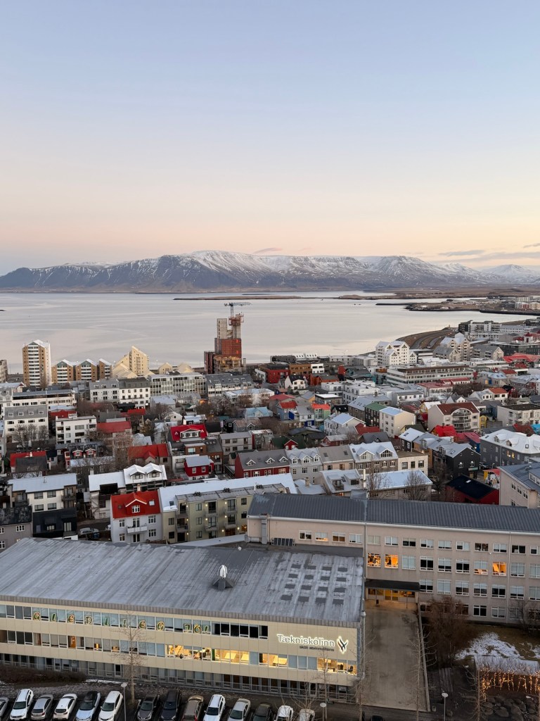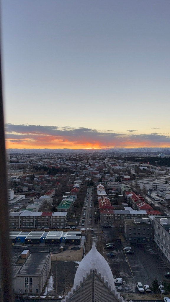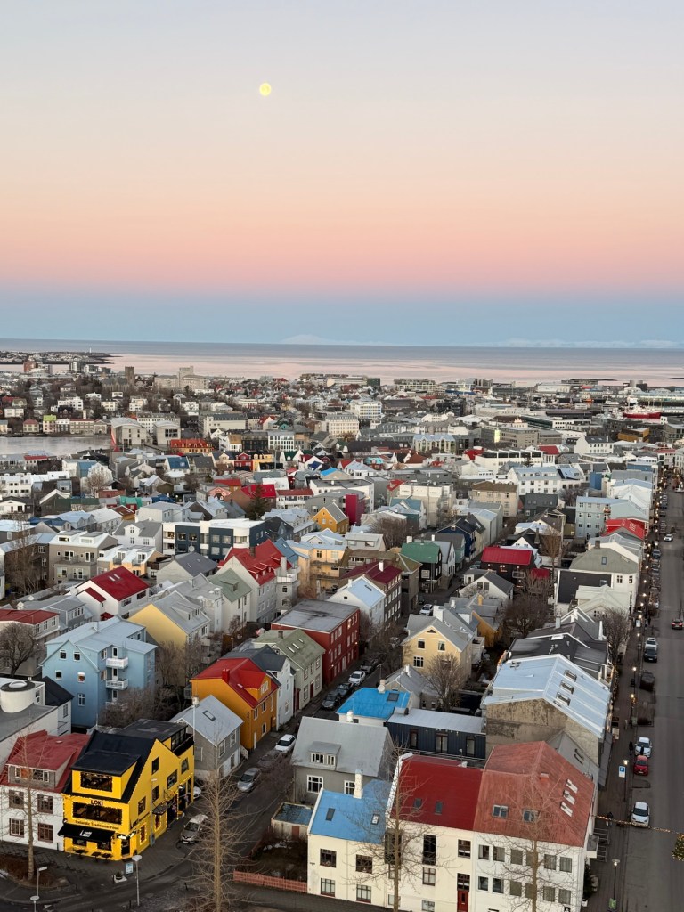 Starting out early? Not really, at 10:00 the moon is still out and only it’s starting to get light.Walking past a world famous bakery. Braud’ home of the best cinnamon bun in the world.Our first destination, Hallgrímskirkja, an Evangelical Lutheran church with a wonderful tower to watch the sunrise.An elevator to the bell tower then stairs to the observation deck. The ‘Oh my’ initial view of the city360 degree view of Reykjavík One minute to 11:00 and the sun peaks out. Sunrise.