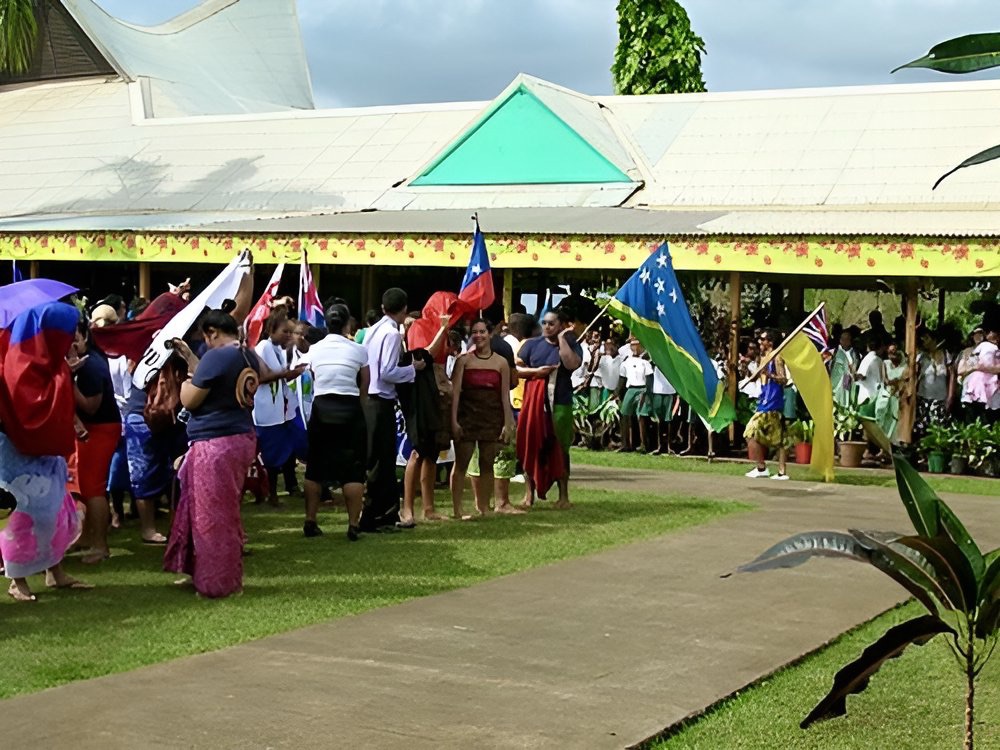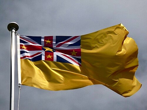 The symbolism represented by the flag is described in the (Niuean flag) Act. The Union Jack symbolises the protection granted by the United Kingdom in 1900 after petitioning by the Kings and Chiefs of Niue. The yellow field symbolises “the bright sunshine of Niue and the warm feelings of the Niuean people towards New Zealand and her people.”[3] The association with New Zealand, which took over responsibility and administration of Niue in 1901, is also represented by the four small stars that depict the Southern Cross. Finally, the blue disc containing a larger star represents the deep blue sea surrounding the self-governing island of Niue.
