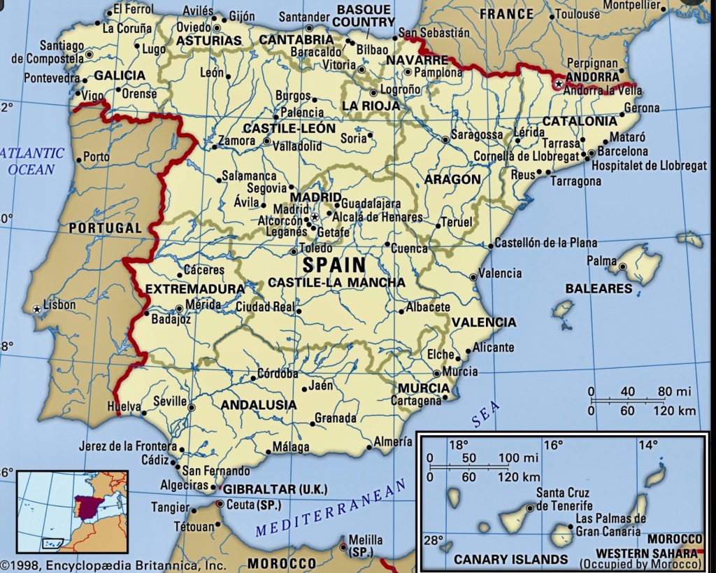 Spain, officially the Kingdom of Spain, is a country in Southernand Western Europe with territories in North Africa. Featuring the southernmost point of continental Europe, it is the largest country in Southern Europe and the fourth-most populous European Union(EU) member state. Spanning the majority of the Iberian Peninsula, its territory also includes the Canary Islands, in the Eastern Atlantic Ocean; the Balearic Islands, in the Western Mediterranean Sea; and the autonomous cities of Ceuta and Melilla, in mainland Africa. Peninsular Spain is bordered to the north by France, Andorra, and the Bay of Biscay; to the east and south by the Mediterranean Sea and Gibraltar and Morocco, through its exclaves in North Africa; and to the west by Portugal and the Atlantic Ocean. Spain’s capital and largest city is Madrid; other major urban areas include Barcelona, Valencia, Seville, Zaragoza, Málaga, Murcia, and Palma de Mallorca.