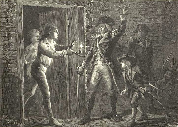 An idealized depiction of Ethan Allen demanding the fort’s surrender