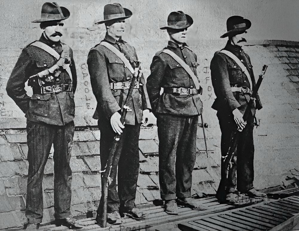 Members of the Irish Citizen Army including Kit Poole (2nd from left) Capt Joseph Byrne (left)